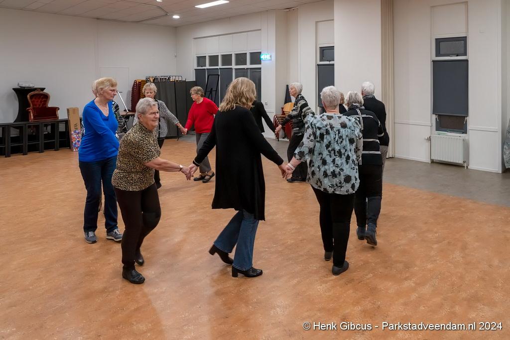Op een stukje gezellige muziek maken de dames een kringdans. Daarna volgt weer een andere dans, waarbij de partner onder de ander doordraait én na enige maten van partner wisselt. Eerst wordt dit geoefend zonder muziek en als de pasjes er goed inzitten, gaat de muziek aan.