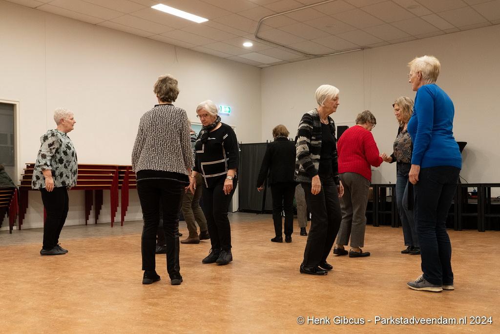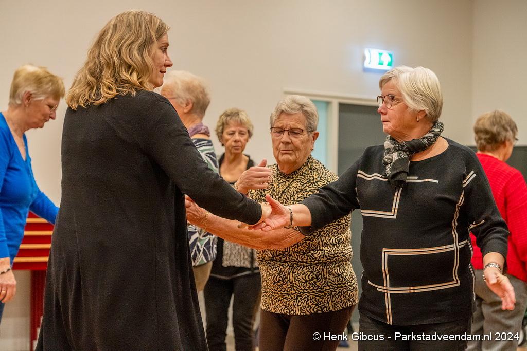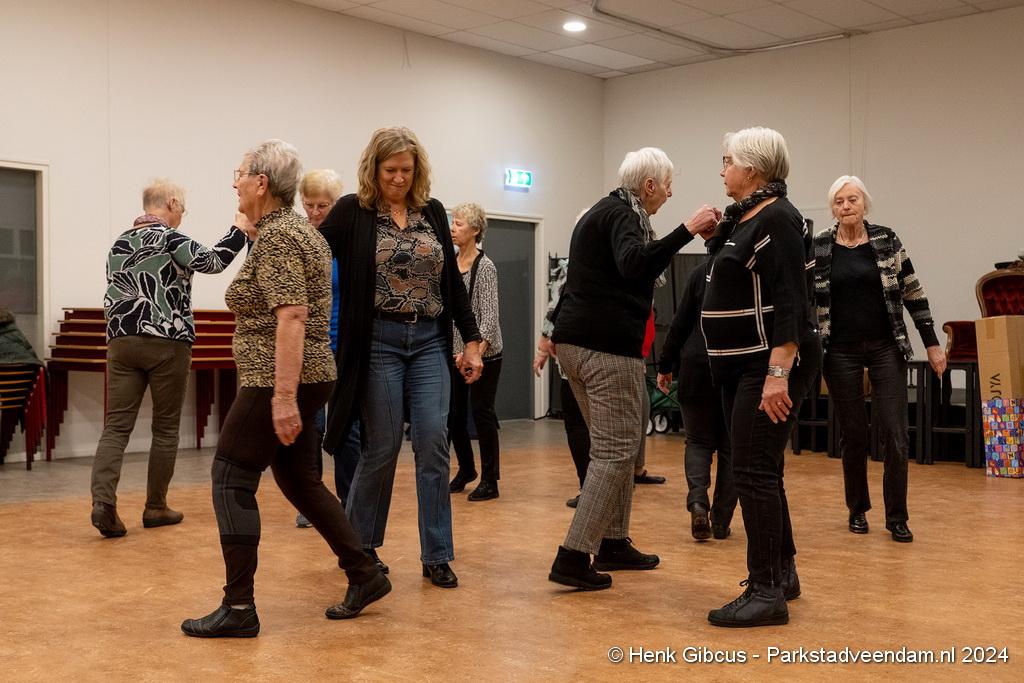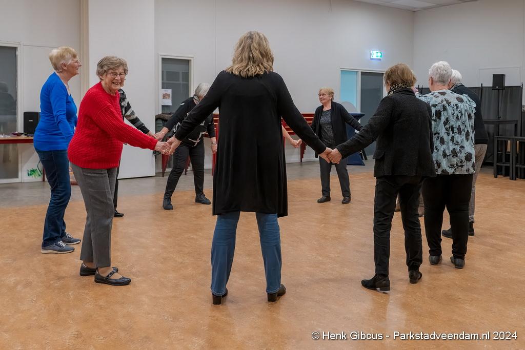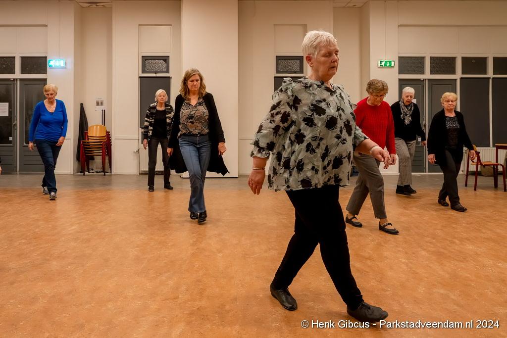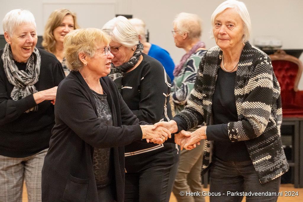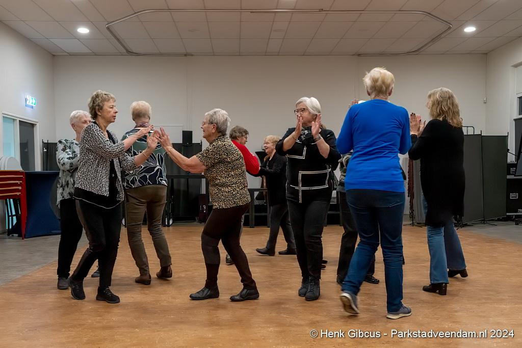 De 3e dans is een tango. Denk daar niet te lichtvoetig over. Je moet goed naar de muziek luisteren - ritme en maat, de pasjes correct uitvoeren – voetenwerk beheersen, uiteraard weten wat links en rechts is én dan ook nog onthouden welke passen je moet maken. Lastig, maar de dames hebben het aardig onder de knie. Het ritme van de tango is verrekte moeilijk! Je kunt zien dat veel dames dit al jaren doen. Het loopt gesmeerd. Ze volgen de aanwijzingen keurig op.