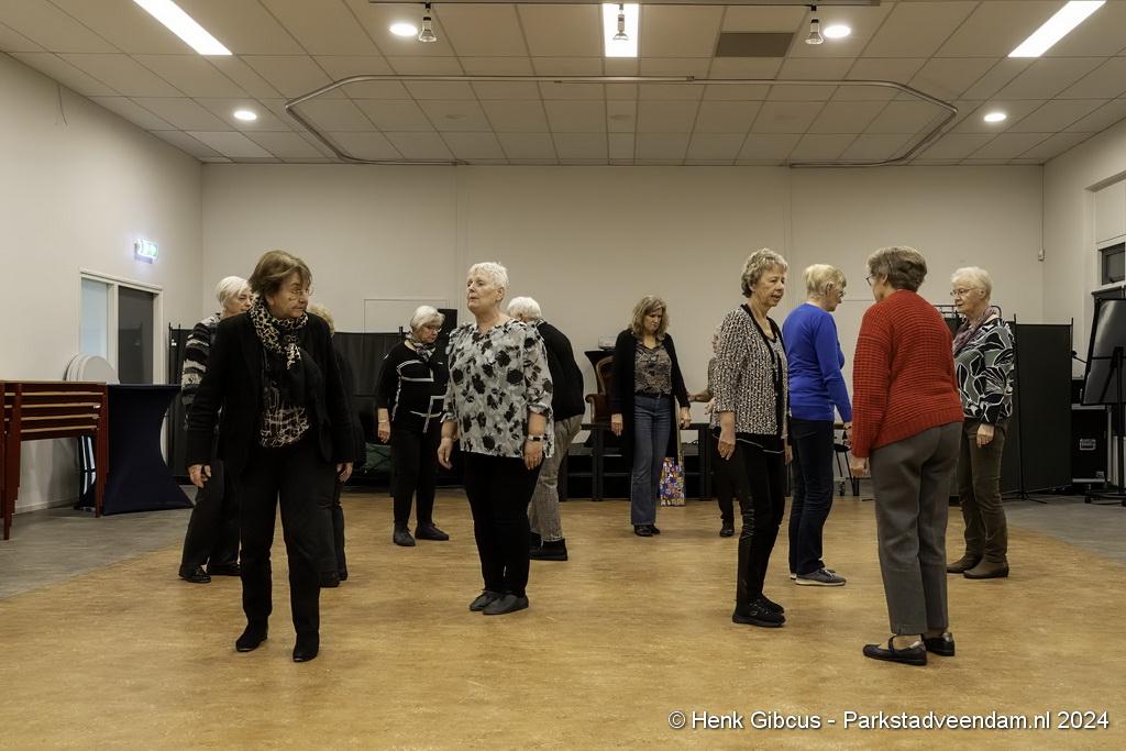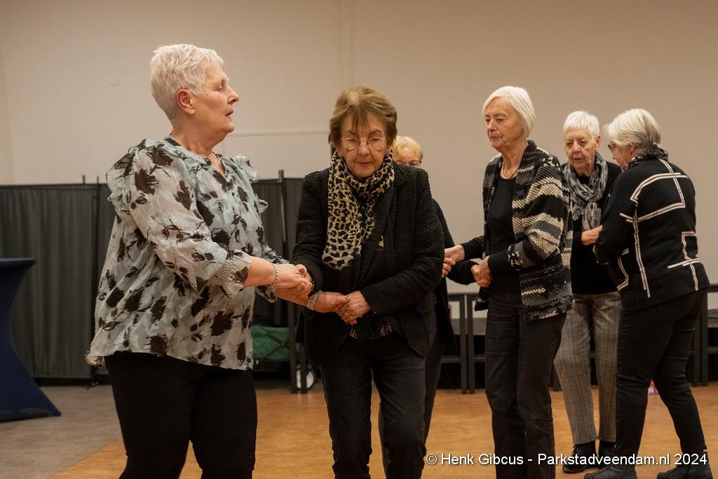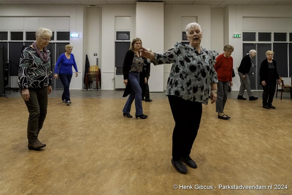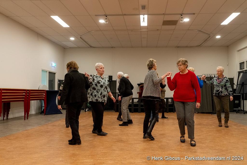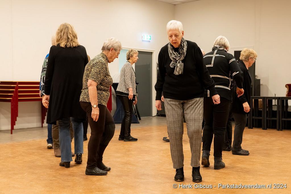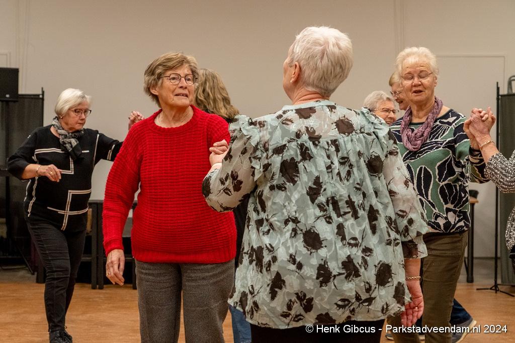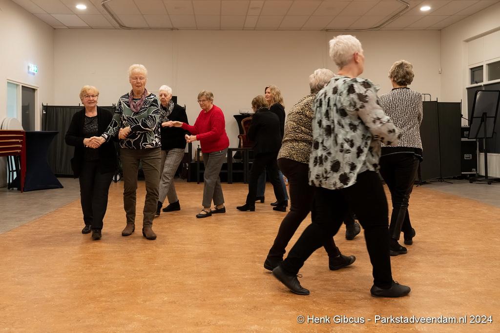 De 3e dans is een tango. Denk daar niet te lichtvoetig over. Je moet goed naar de muziek luisteren - ritme en maat, de pasjes correct uitvoeren – voetenwerk beheersen, uiteraard weten wat links en rechts is én dan ook nog onthouden welke passen je moet maken. Lastig, maar de dames hebben het aardig onder de knie. Het ritme van de tango is verrekte moeilijk! Je kunt zien dat veel dames dit al jaren doen. Het loopt gesmeerd. Ze volgen de aanwijzingen keurig op.