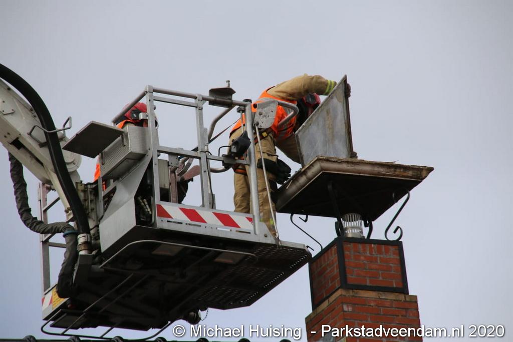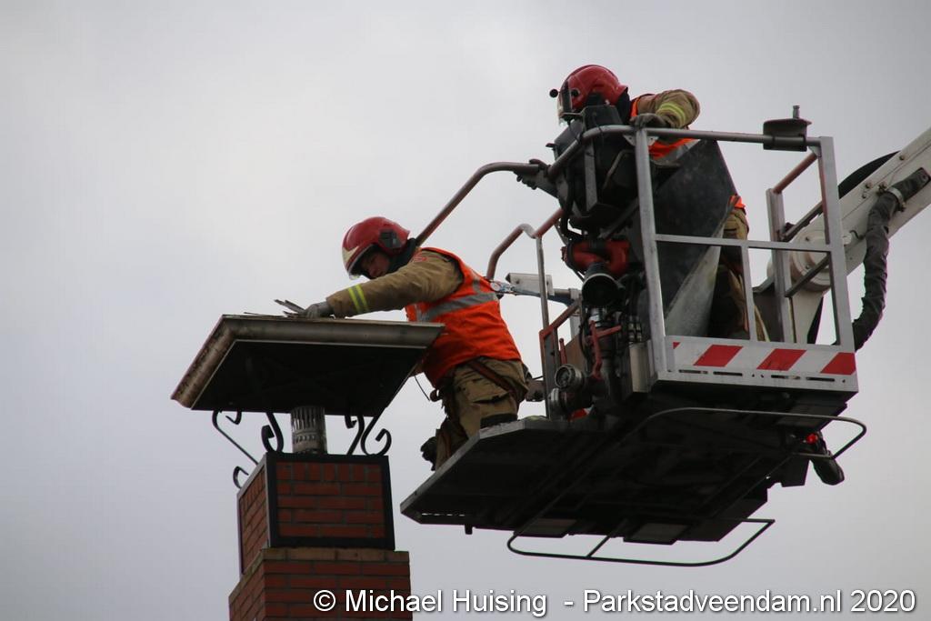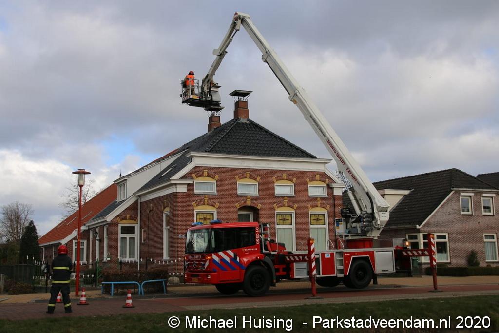 De brandweer van Pekela werd zondagmorgen opgeroepen voor het verhelpen van een stormschade. Aan de Albatrosstraat B had een deel van een schoorsteenkap losgelaten.