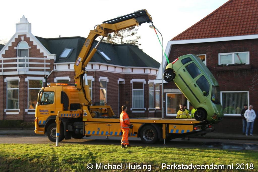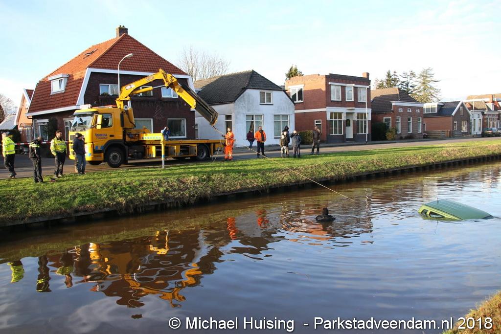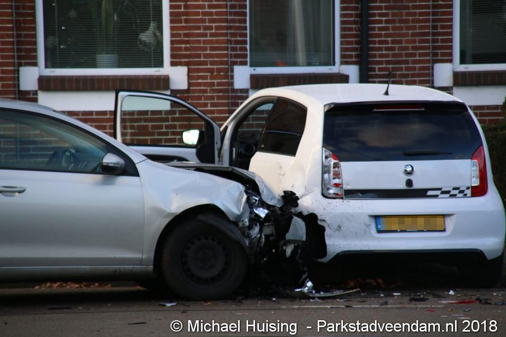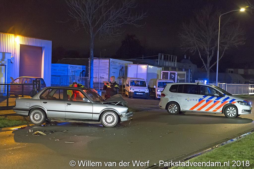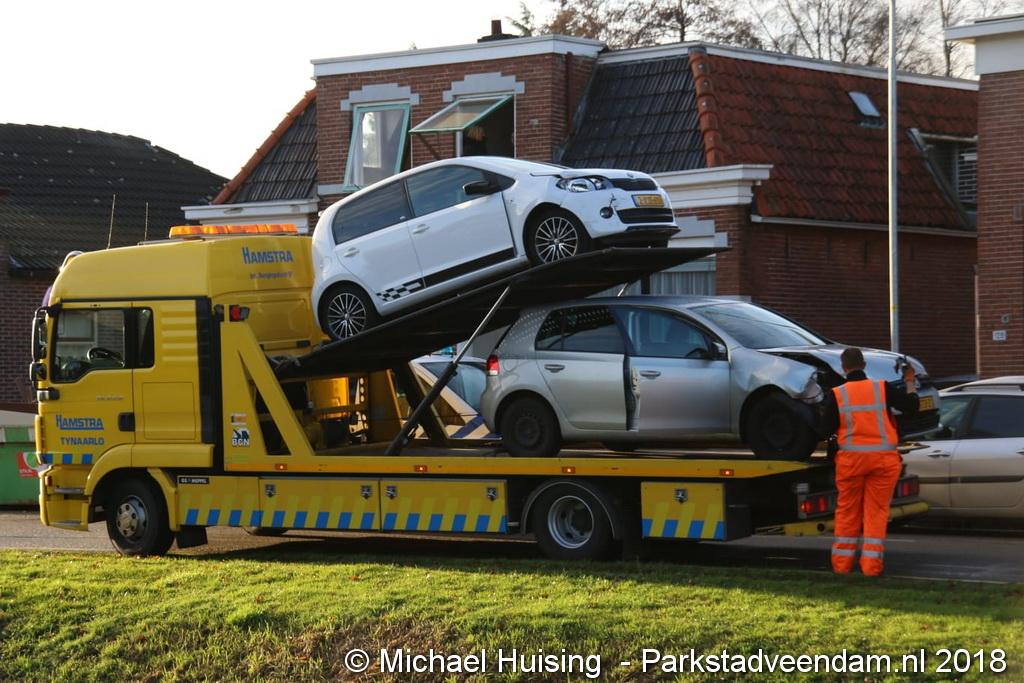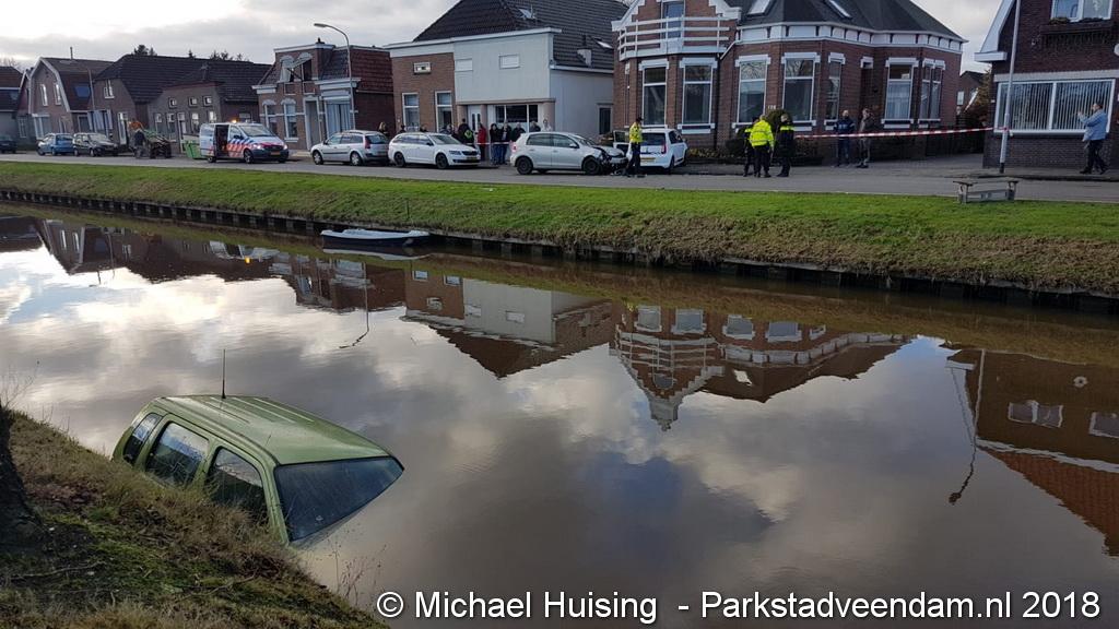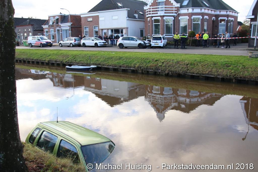 Maandagmiddag zijn op de J.Kammingastraat twee auto's op elkaar gebotst. Dit gebeurde nadat de bestuurster van de witte auto de oprit bij de woning wilde oprijden. Een achterop komende auto had dit niet in de gaten en botste op de auto. Of de laagstaande zon een rol heeft gespeeld is niet bekend. Door de klap schoot de witte auto tegen een geparkeerde auto, deze belandde hierdoor in het water.