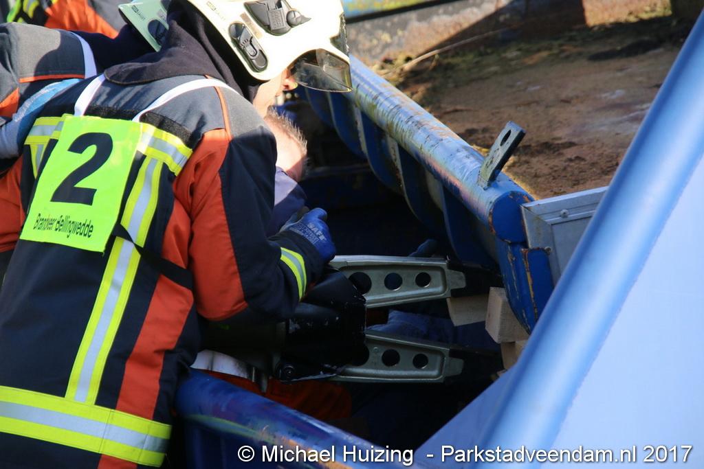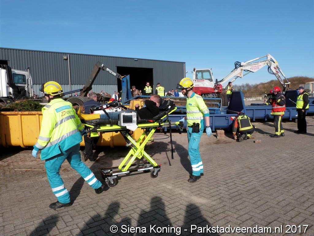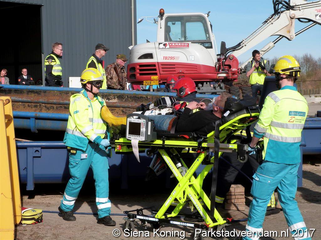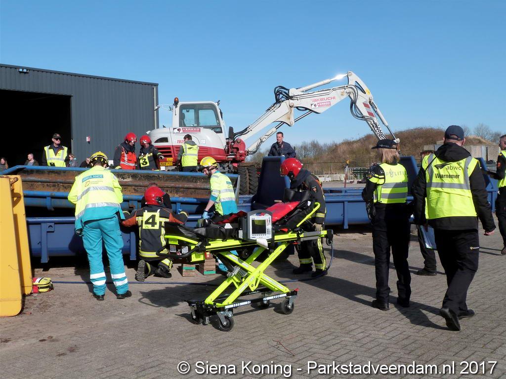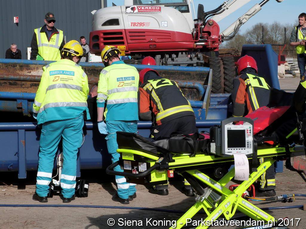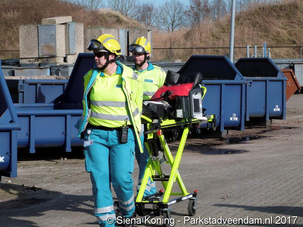 112 baan - Hier werd een gemeente medewerker aangetroffen die met een been bekneld lag onder een container. Naast de TS kwam er ook een HV ter plaatse. Tijdens het bevrijden van dit slachtoffer klinken er na enige tijd een aantal schoten van een jager. Door deze knallen schrikt een andere medewerker van de gemeente die bezig was een vijzel schoon te maken en raakt hierin bekneld. Vervolgens moet dit slachtoffer ook worden bevrijdt.