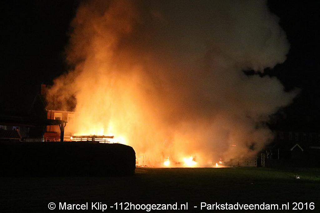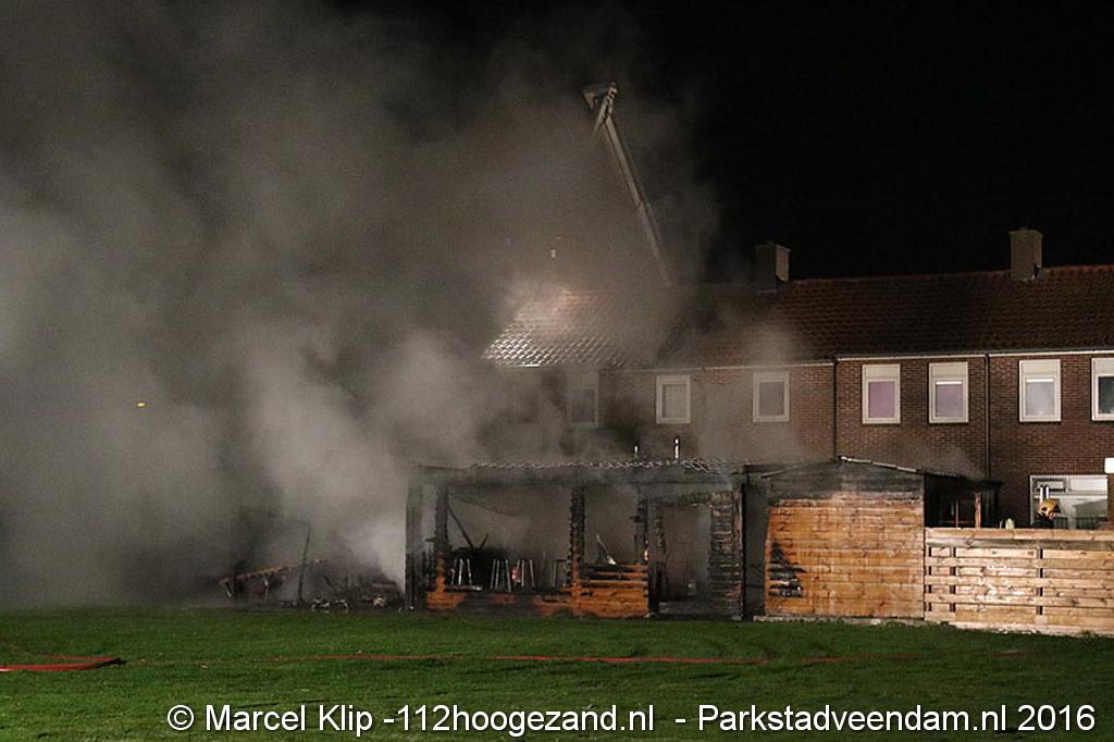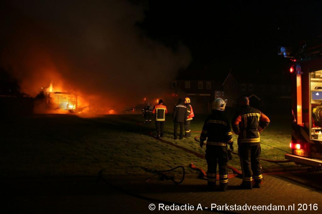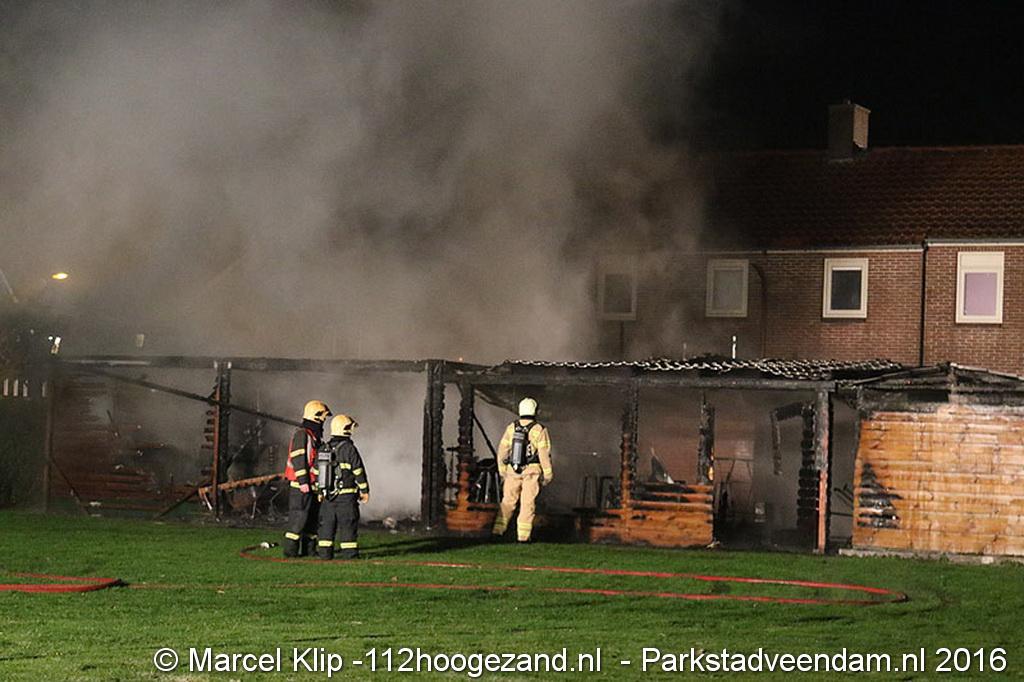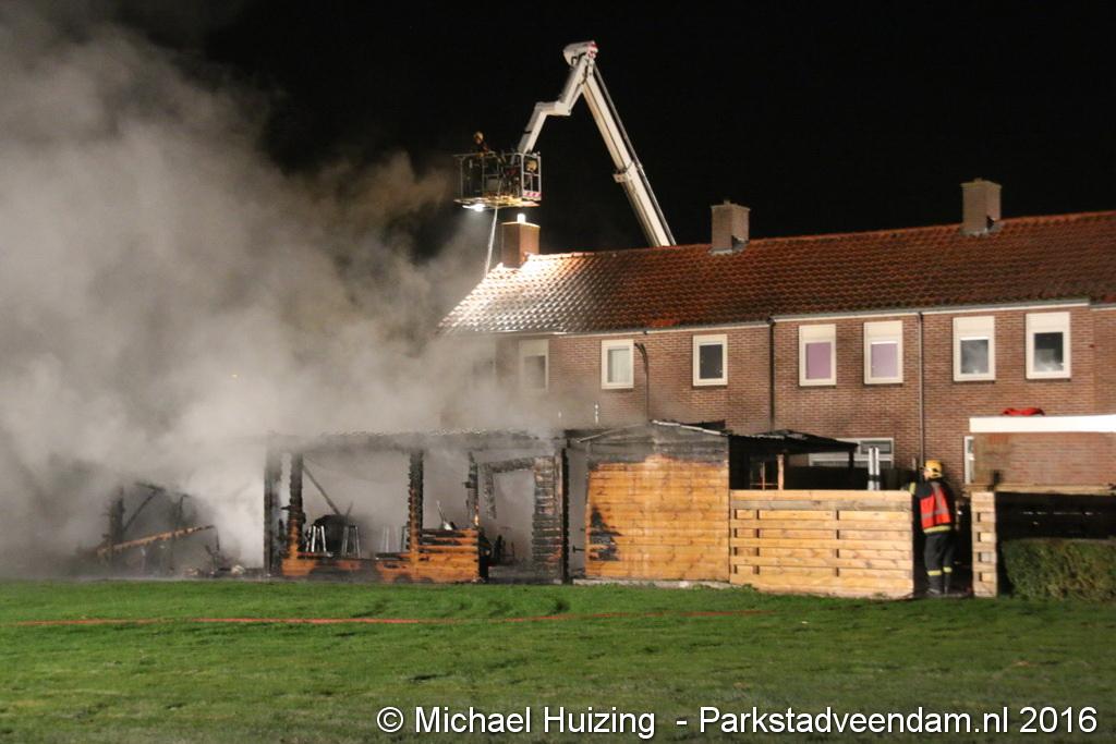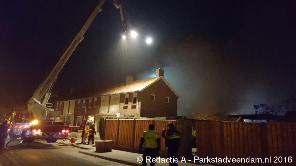 Persvoorlichter brandweer meld: We zijn de brand meester. De geschakelde schuurtjes achter meerdere woningen zijn door de brand grotendeels verloren gegaan. We blussen de gloeiende resten na. Door snel optreden hebben we de woningen kunnen behouden. We controleren en ventileren deze.