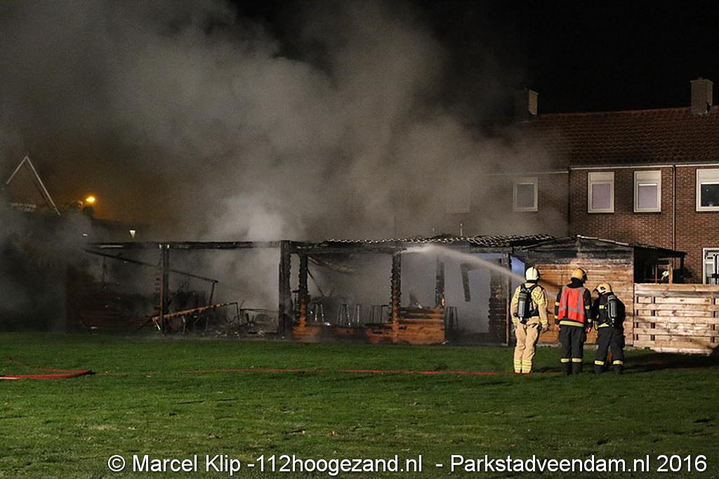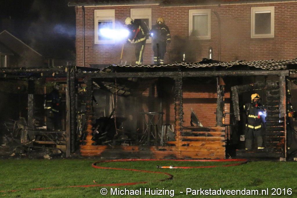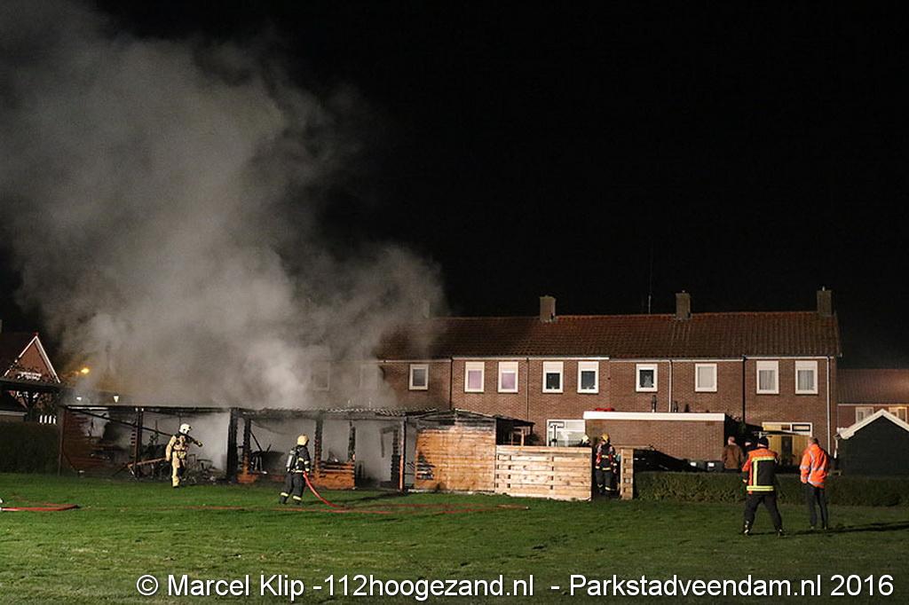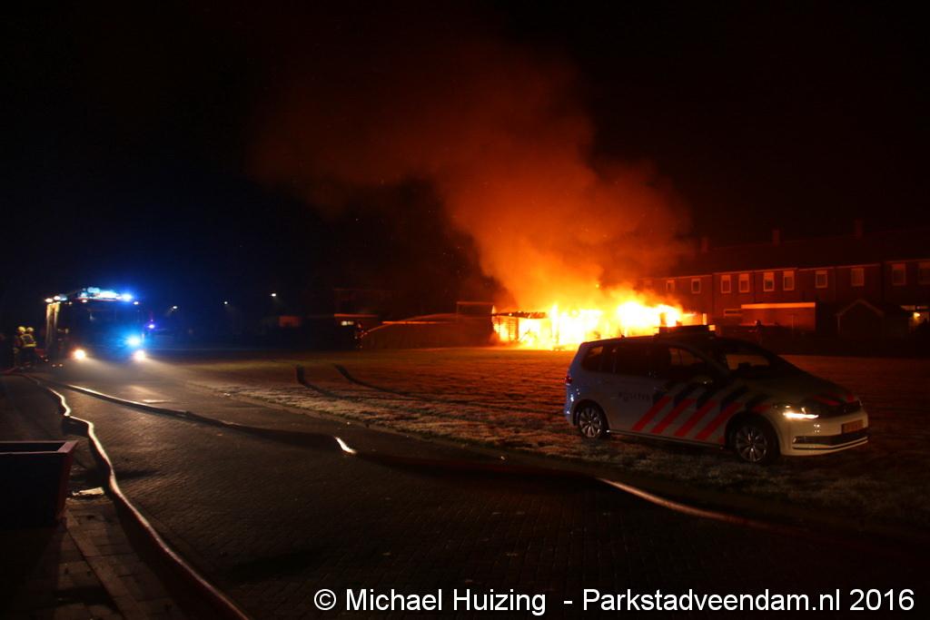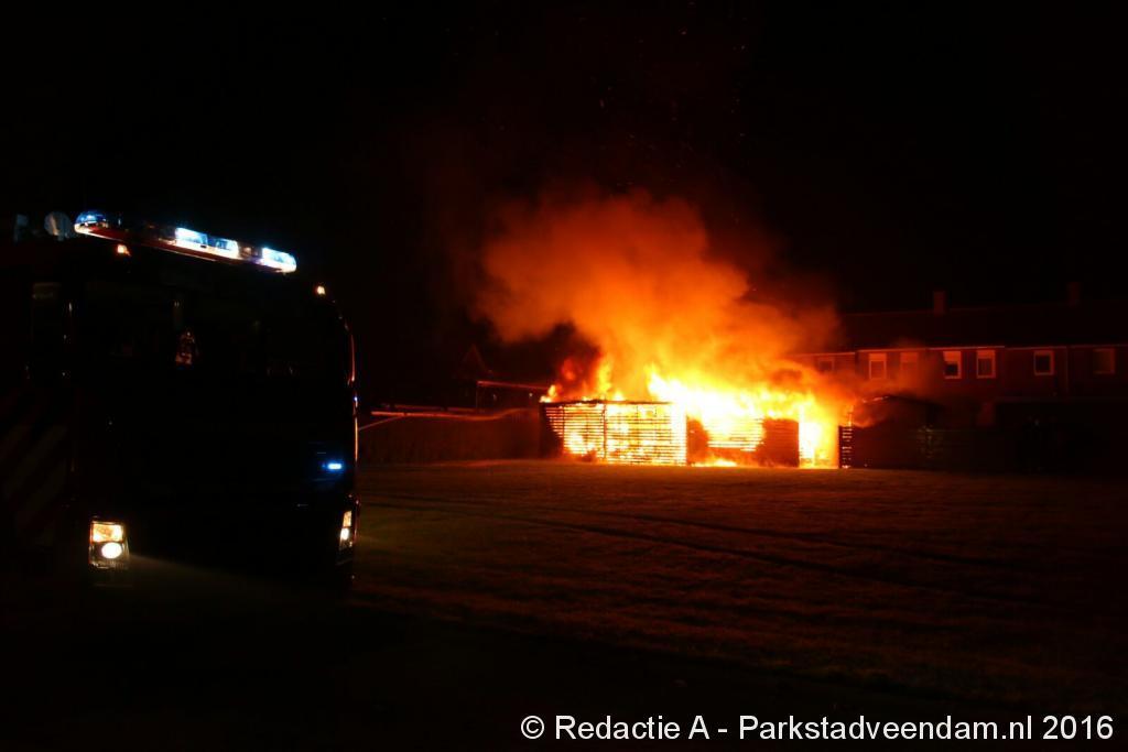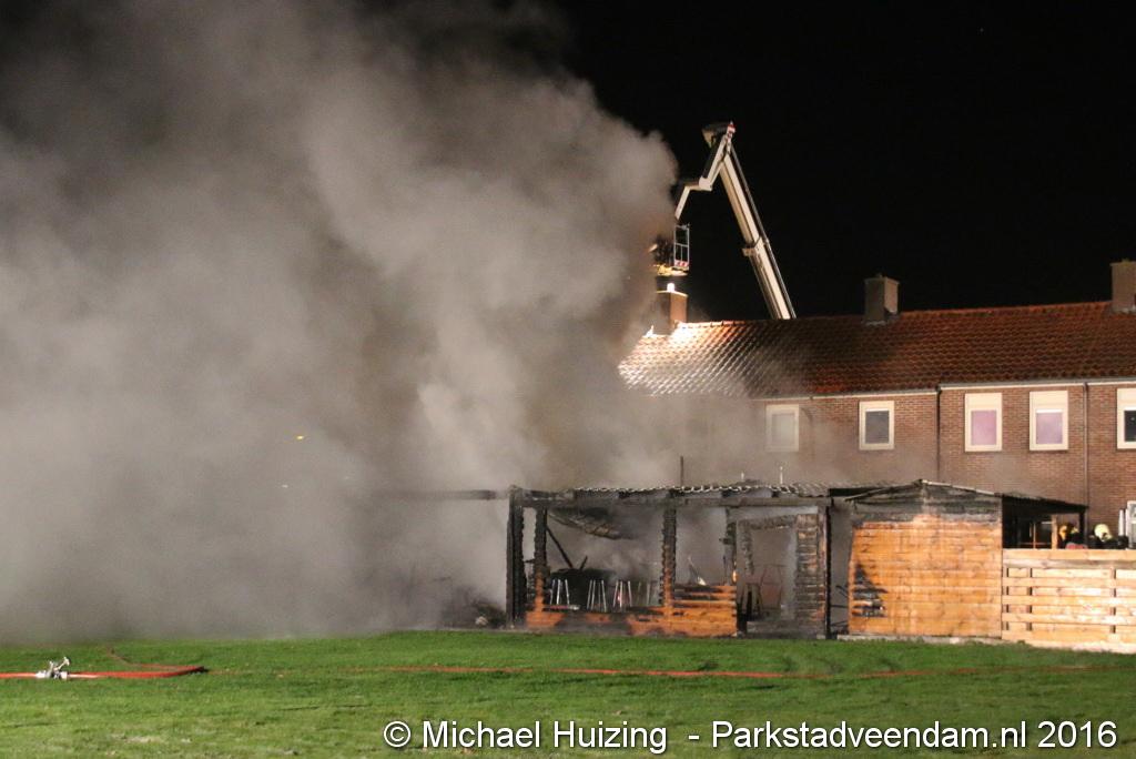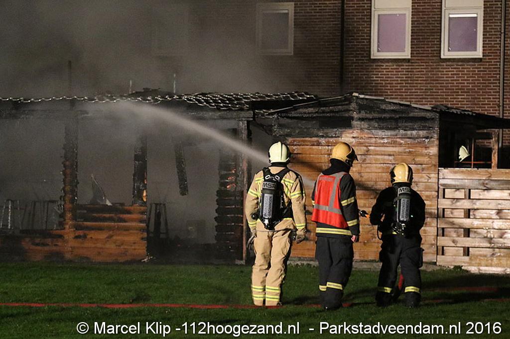 Persvoorlichter brandweer meld: We zijn de brand meester. De geschakelde schuurtjes achter meerdere woningen zijn door de brand grotendeels verloren gegaan. We blussen de gloeiende resten na. Door snel optreden hebben we de woningen kunnen behouden. We controleren en ventileren deze.