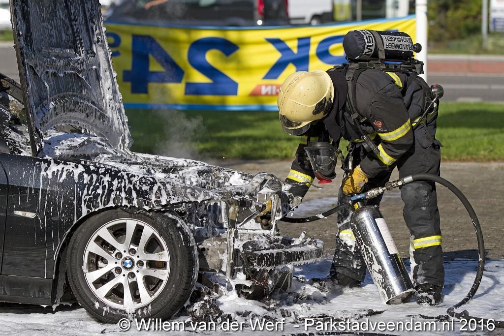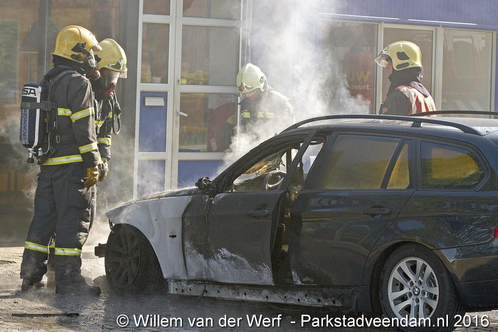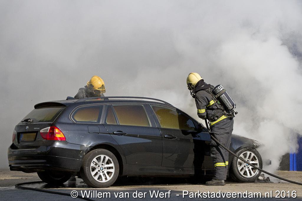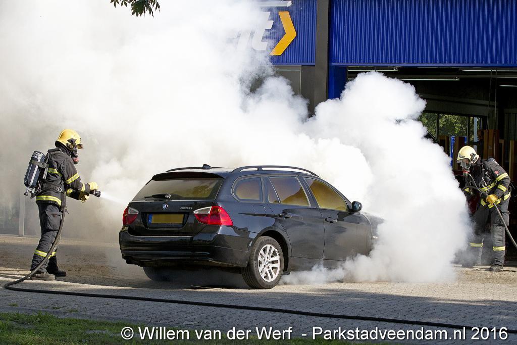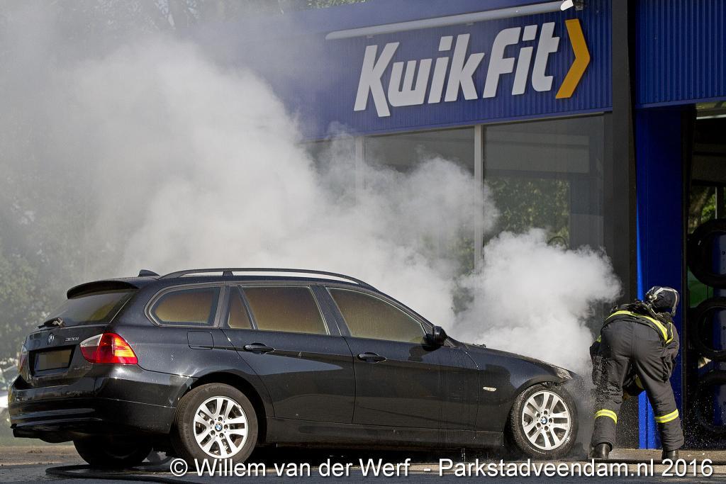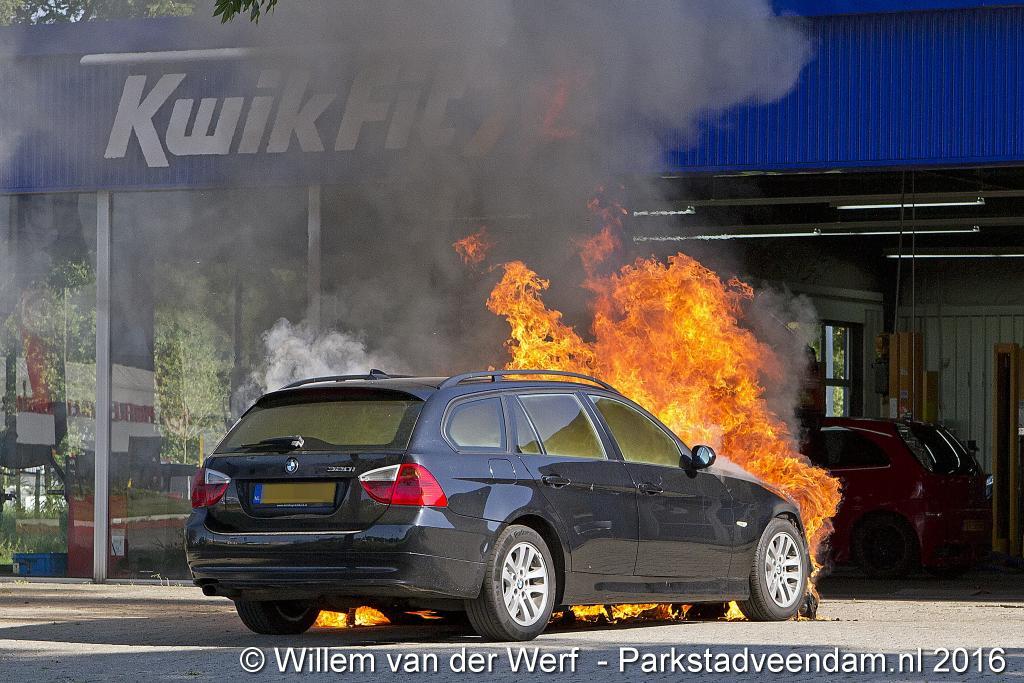 CERESLAAN - Woensdagmiddag is bij de Kwik-fit Veendam een auto in vlammen opgegaan.  De brandweer was snel ter plaatse en ging de vuurzee  te lijf met twee hoge druk spuiten. De auto werd nageblust met schuim.