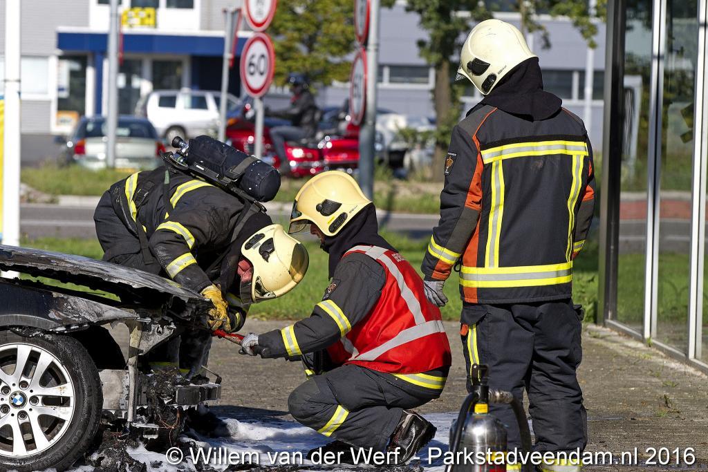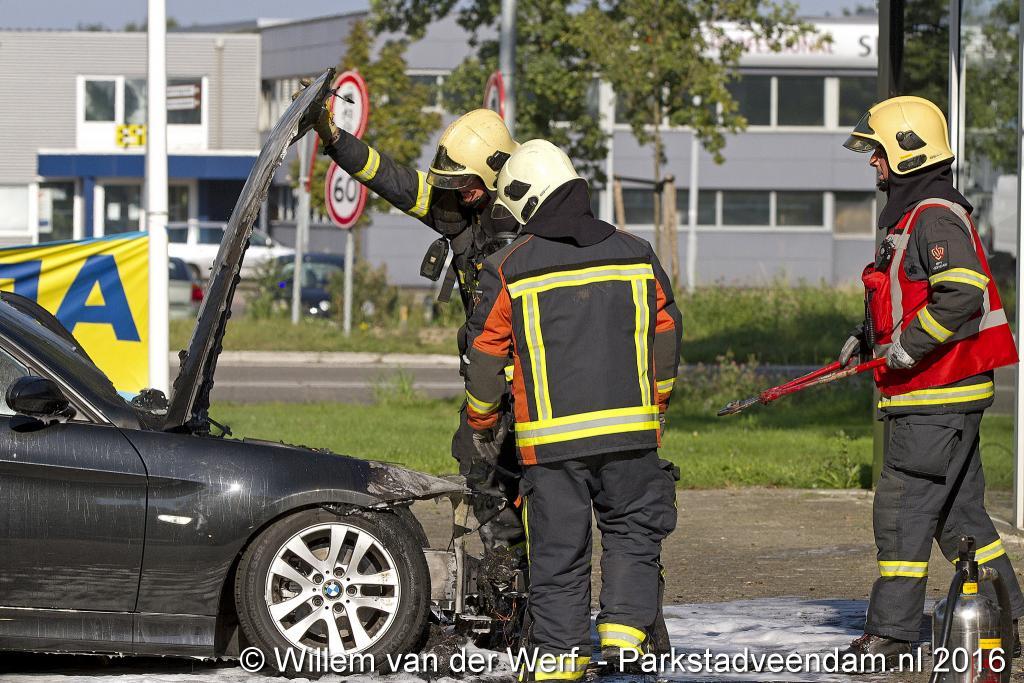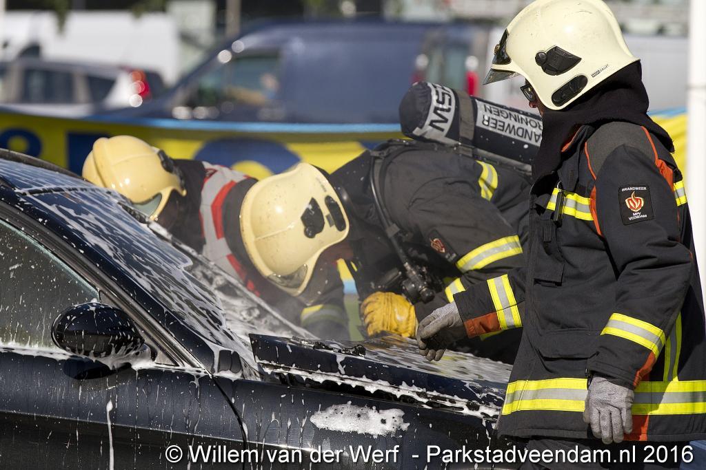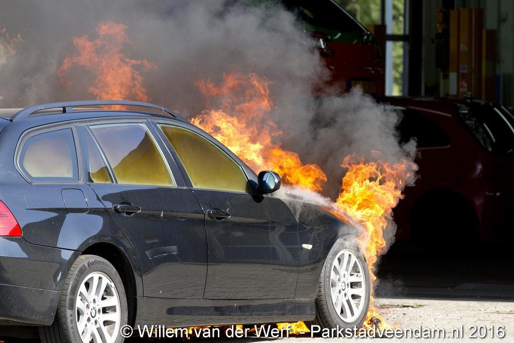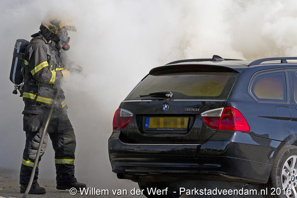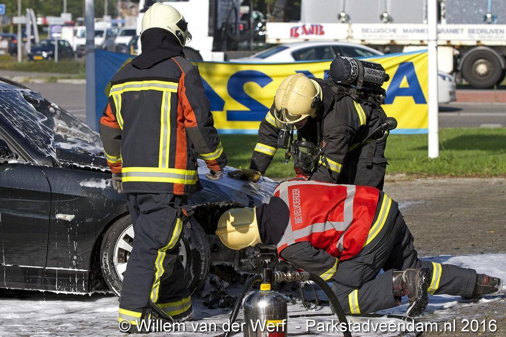 CERESLAAN - Woensdagmiddag is bij de Kwik-fit Veendam een auto in vlammen opgegaan.  De brandweer was snel ter plaatse en ging de vuurzee  te lijf met twee hoge druk spuiten. De auto werd nageblust met schuim.