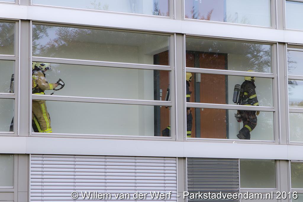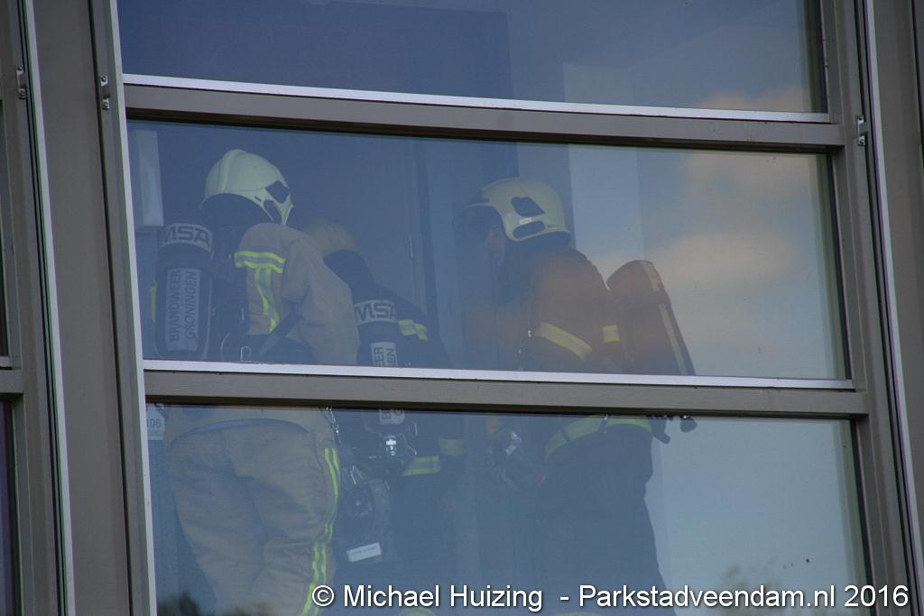 Na diverse gangen en kamers te hebben doorzocht werd er uiteindelijk geen brand aangetroffen. De beide voertuigen keerde daarop terug naar de kazerne.