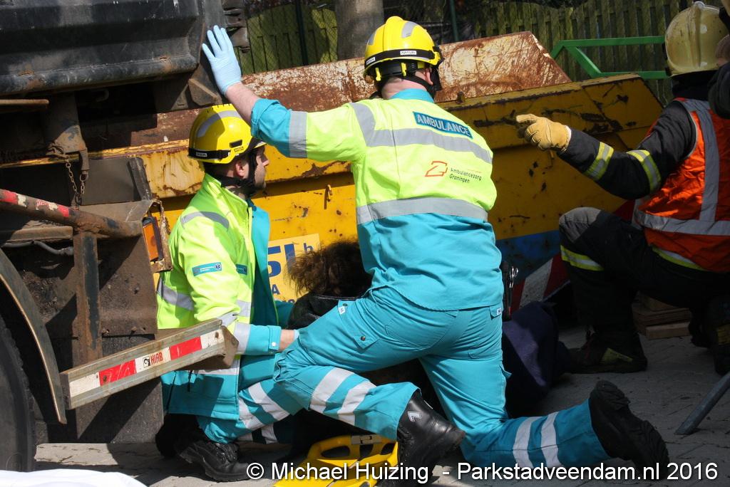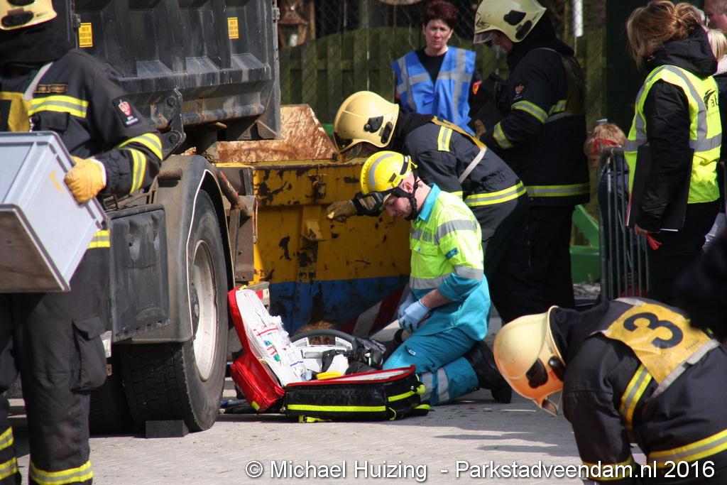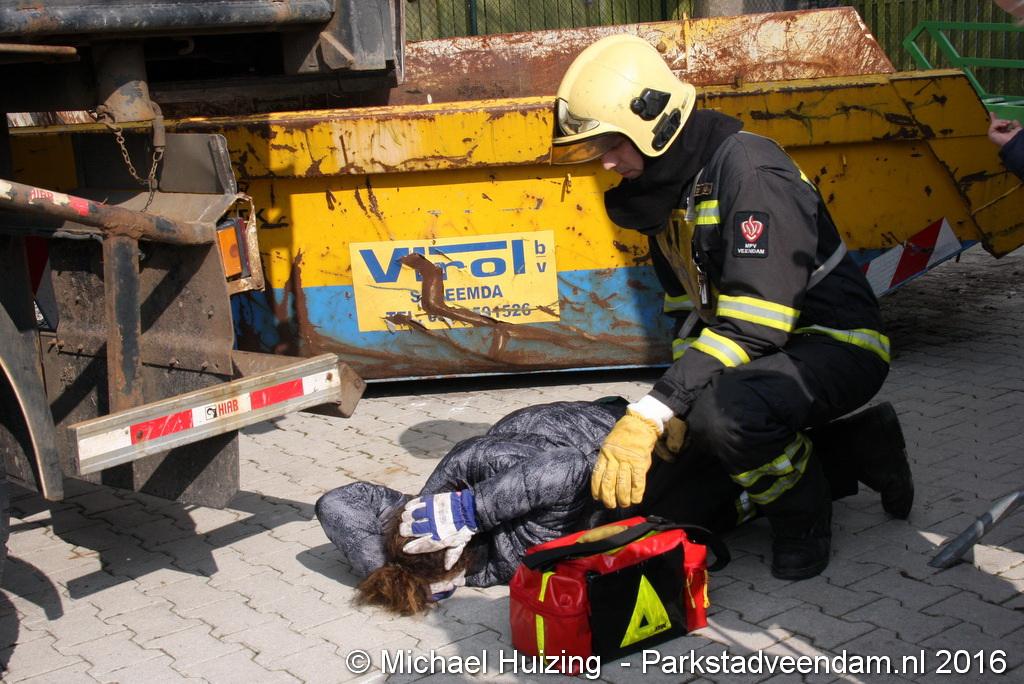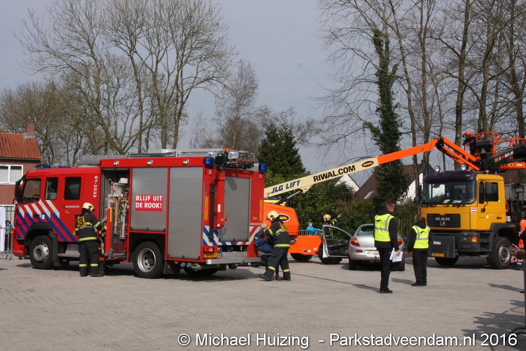 BEERTA - Brandweer Veendam heeft zaterdag 09 april meegedaan aan de 112 vaardigheidstoetsen in Beerta. De toetsen werden georganiseerd door de brandweerpost van Finsterwolde. Er deden 9 ploegen mee op de 112 baan, waar een scenario van een ongeval zo goed mogelijk volgens de richtlijnen moet worden opgelost. Vandaag ging het mis tijdens het snoeien van een aantal bomen nadat een dronken automobiliste een hoogwerker en een vrachtauto van de gemeente heeft geramd. De persoon in de hoogwerker zaagt zich in de arm en kan de hoogwerker niet meer bedienen. Achter de gemeente vrachtwagen raakt een persoon bekneld met een been onder een container.  Veendam wist de 2e plaats te behalen en is hiermee door naar de gewestelijke toets op 21 mei in Appingedam .