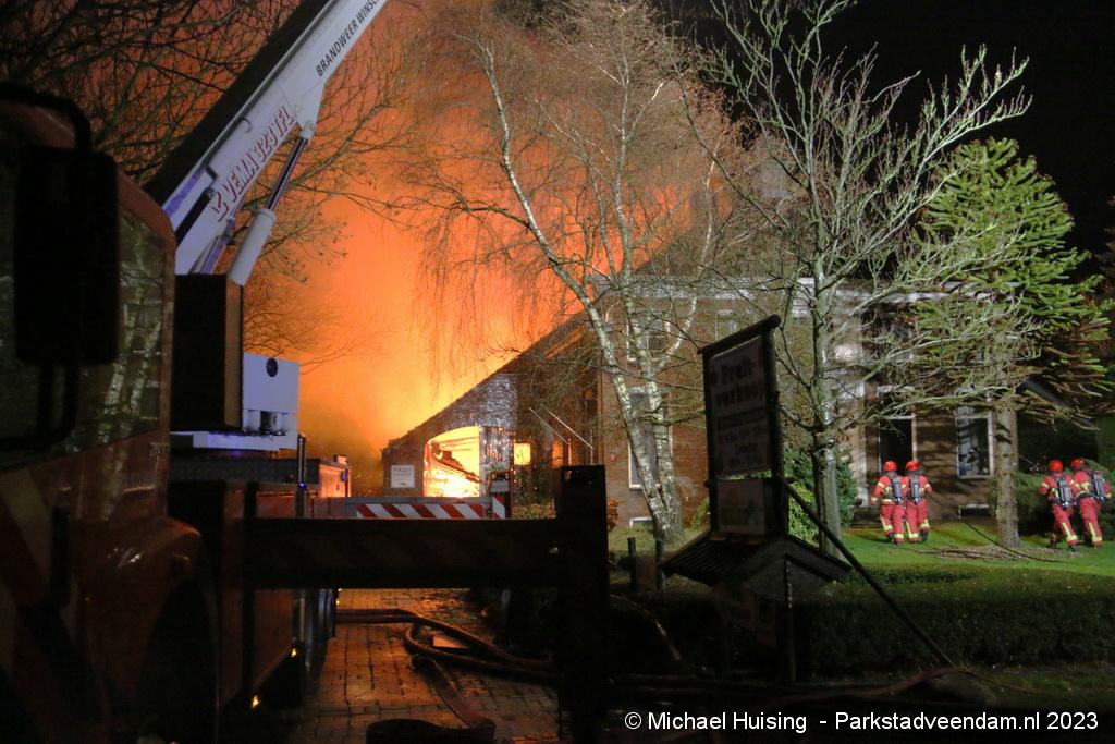 Maar al snel bleek dat de brand uitslaand was, hierop werd groot opgeschaald. Brandweer Slochteren, Wagenborgen en Veendam met het grootwatertransport gingen hierop ter plaatse.