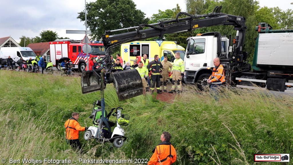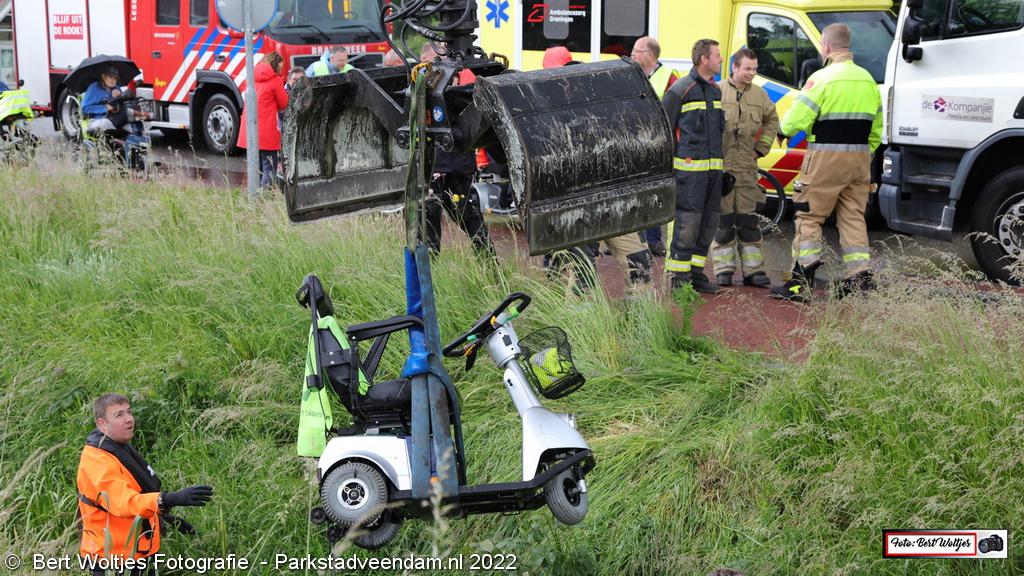 Op de Industrieweg ging het mis. Een scootmobiel reed een diepe sloot in als gevolg van een uitwijkmanoeuvre. De bestuurder kwam er goed vanaf, maar de scootmobiel moest met een kraanwagen van de gemeente Veendam uit de sloot worden gehaald. Politie, ambulance en de brandweer verleenden eerste hulp.