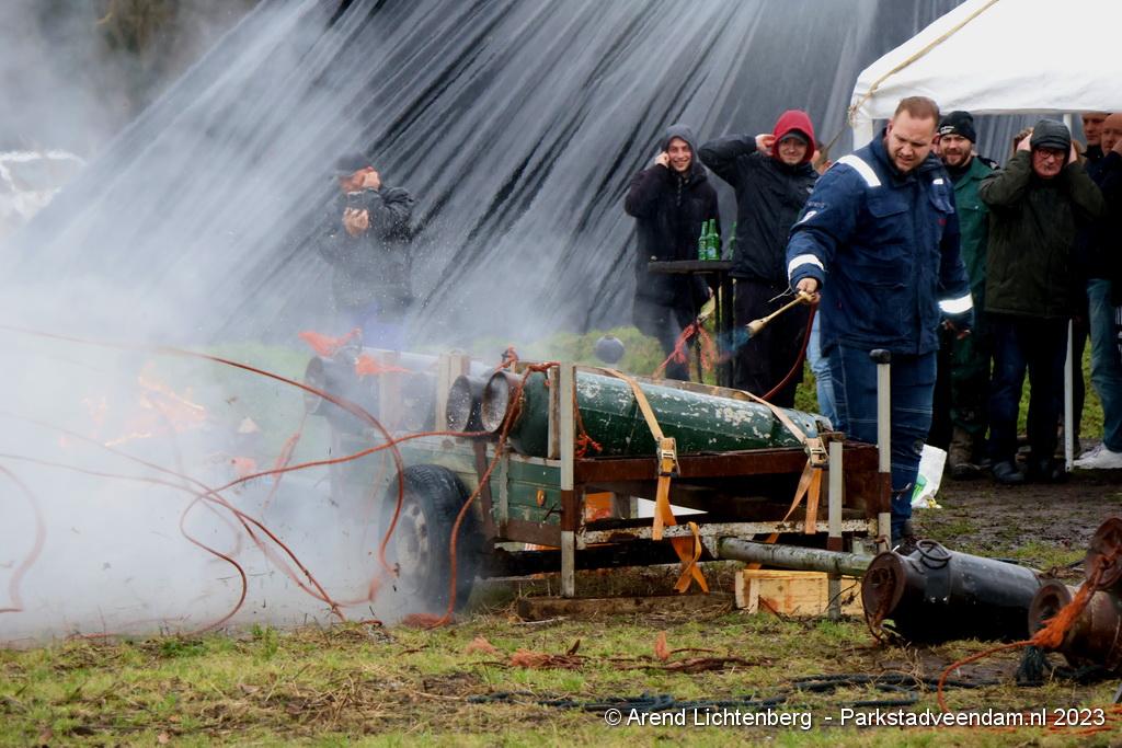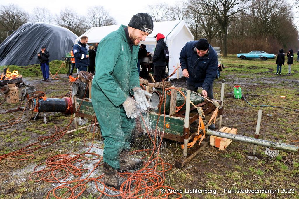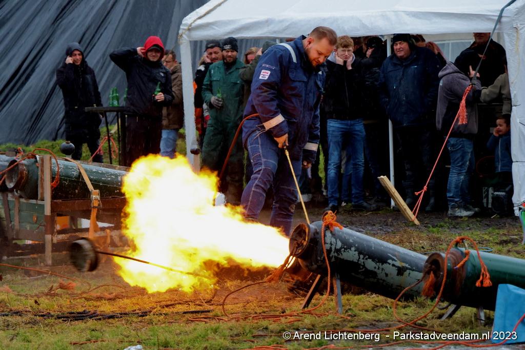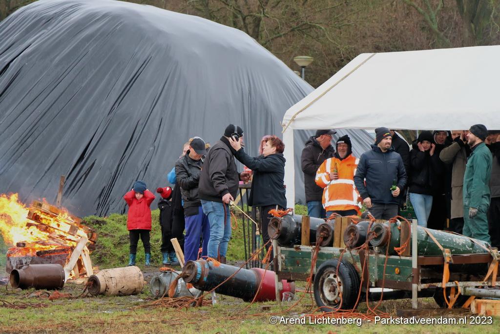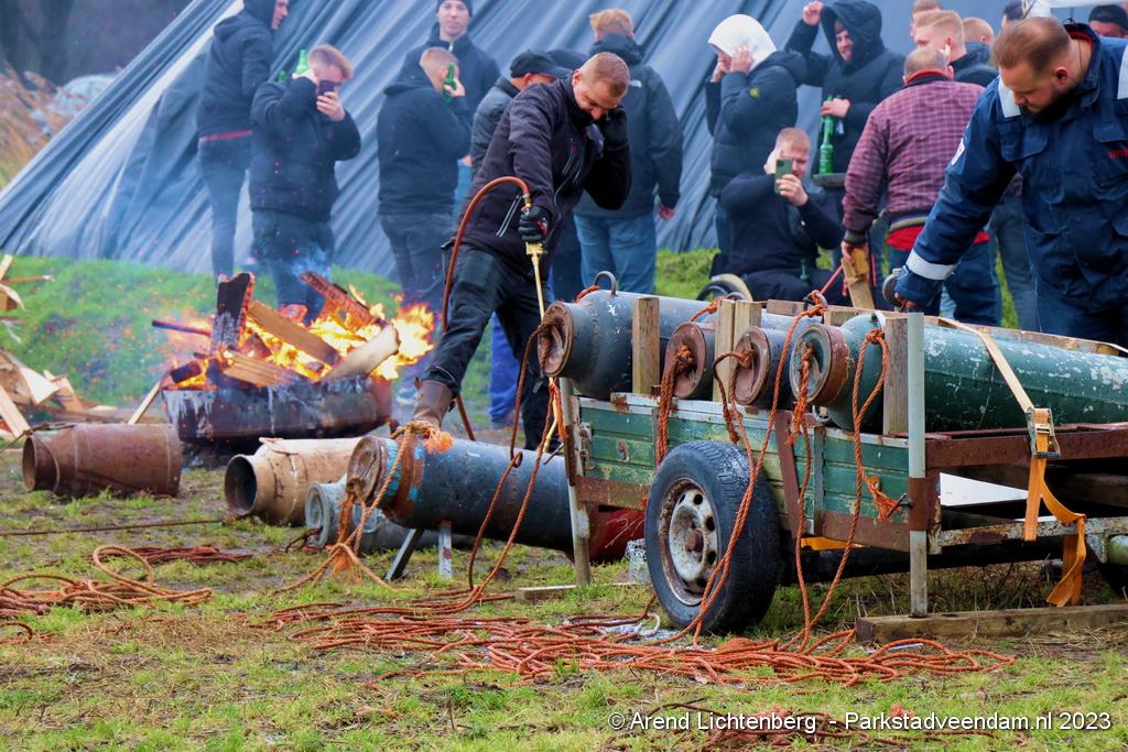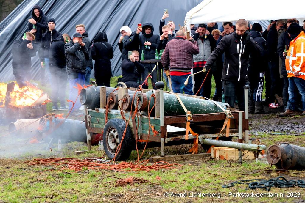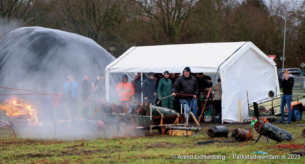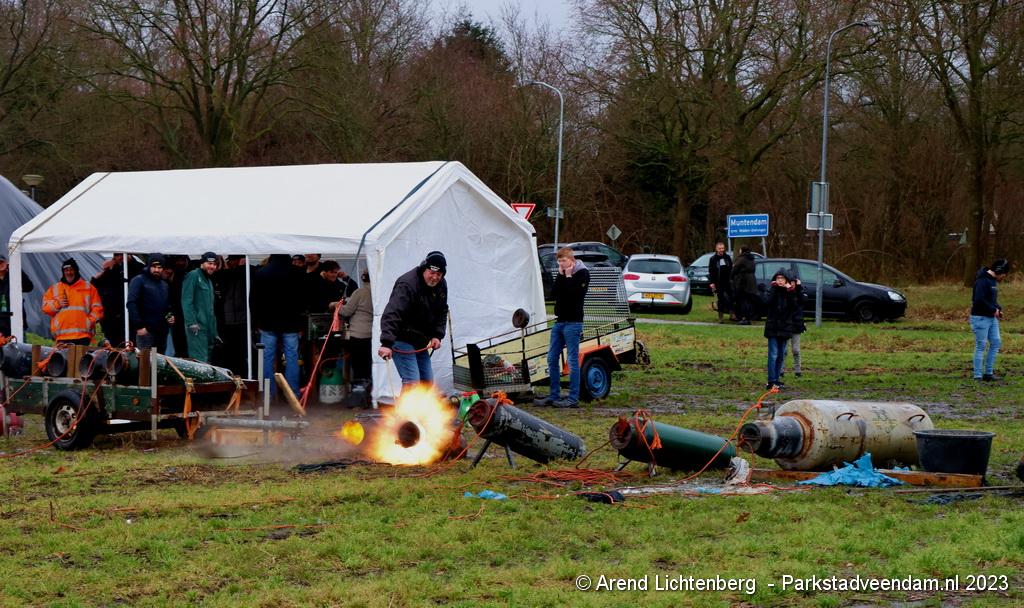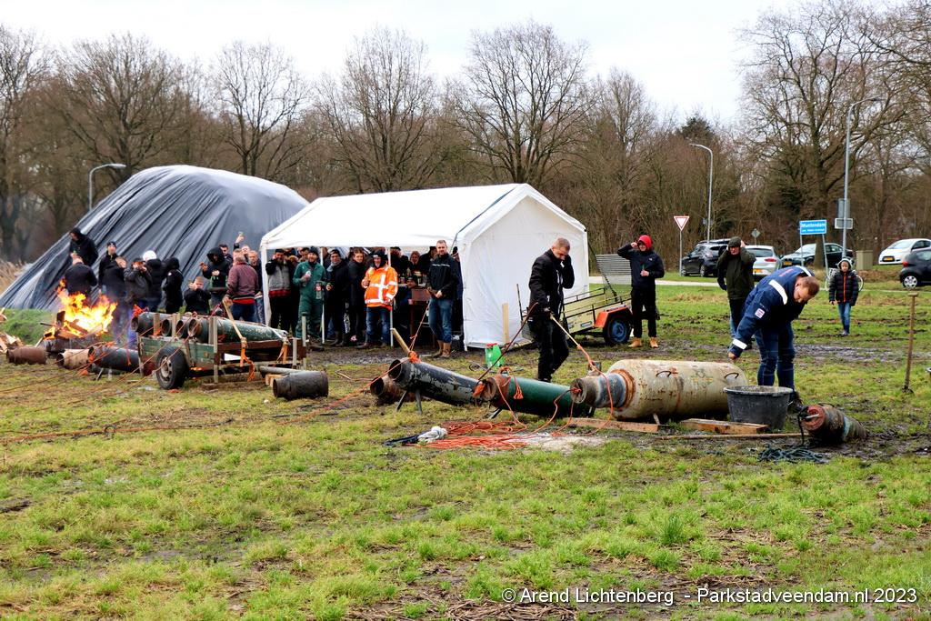 De Vrolijke Drinkers uit Muntendam zijn  sinds zondagmorgen aan het carbidschieten op het landbouwgrond Veenpad Veendam / Muntendam. Het carbidteam bestaat uit 10 Muntendammers.  Vele passerende fietsers bleven even staan kijken naar de carbidschieten.