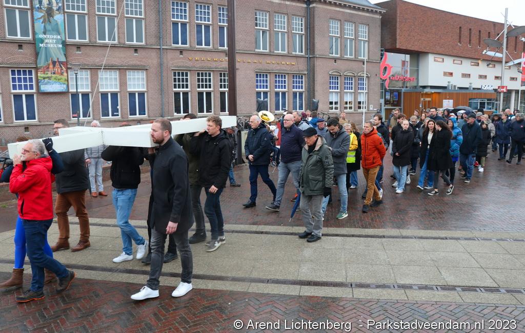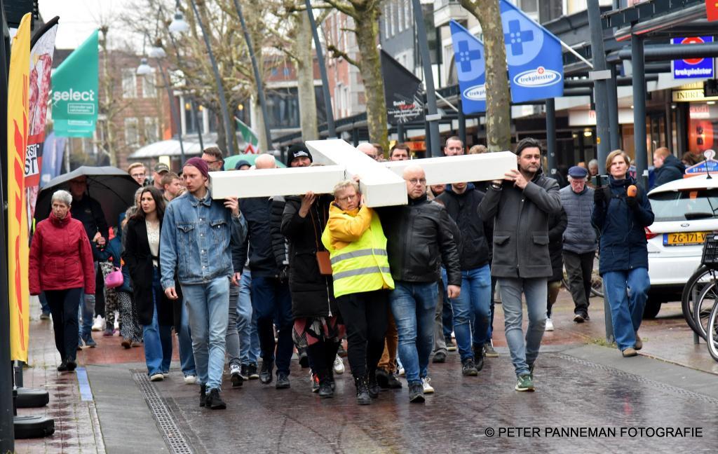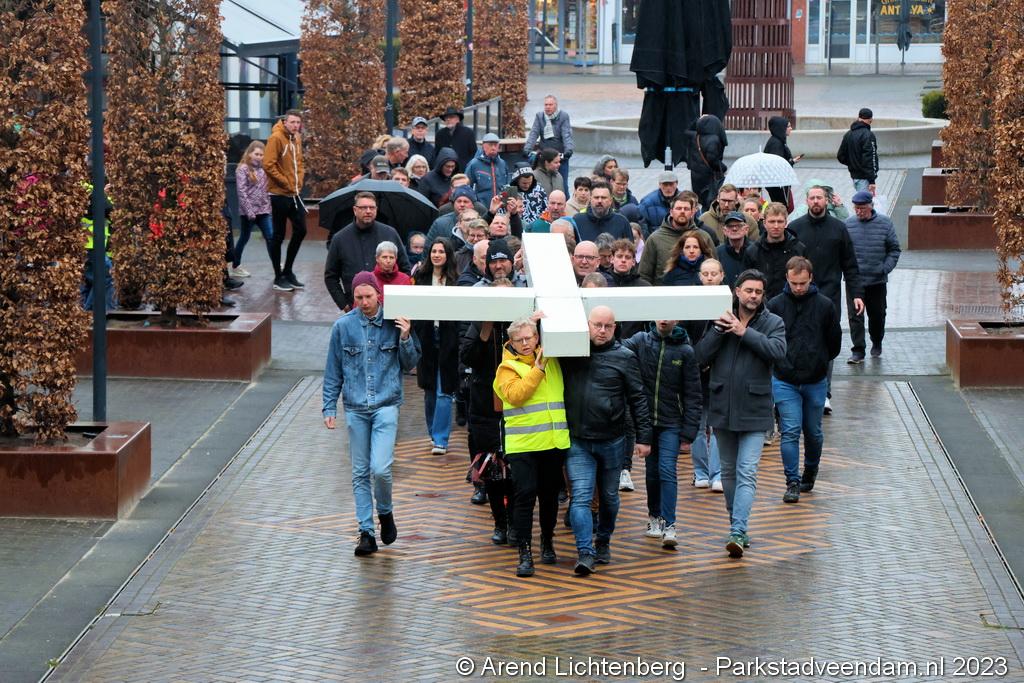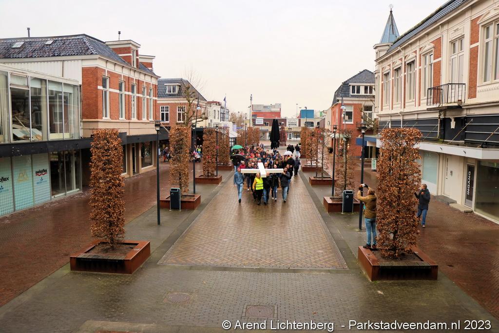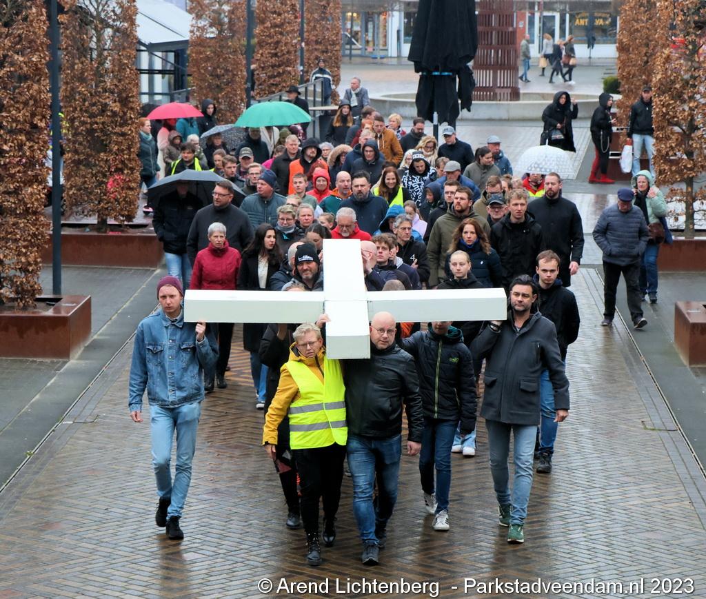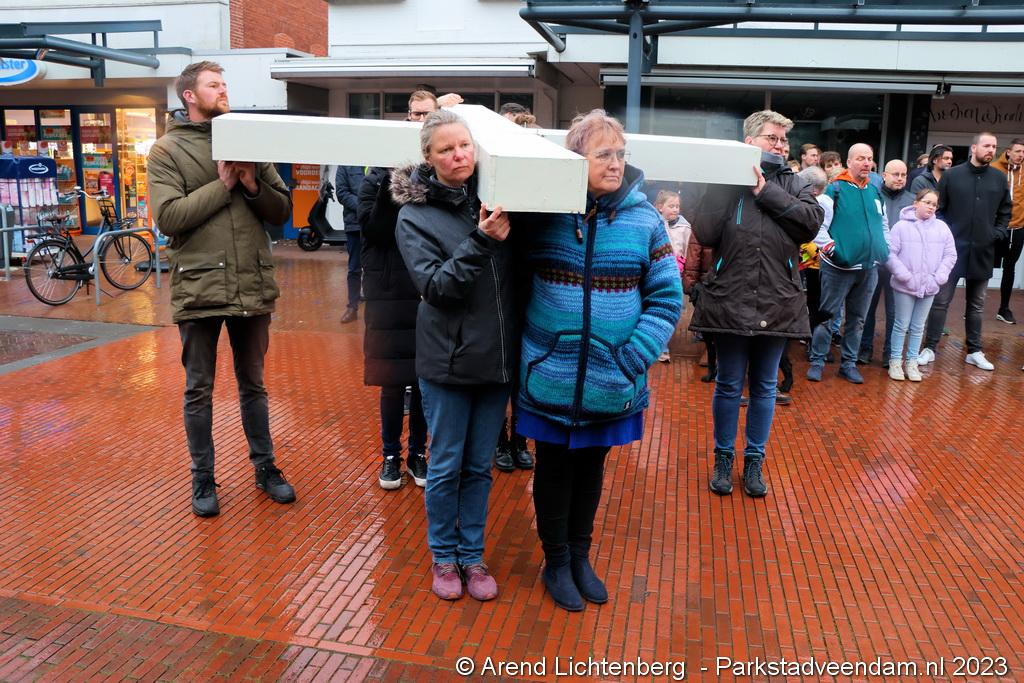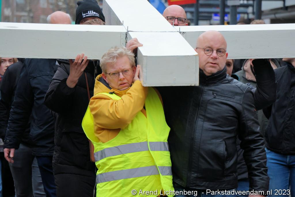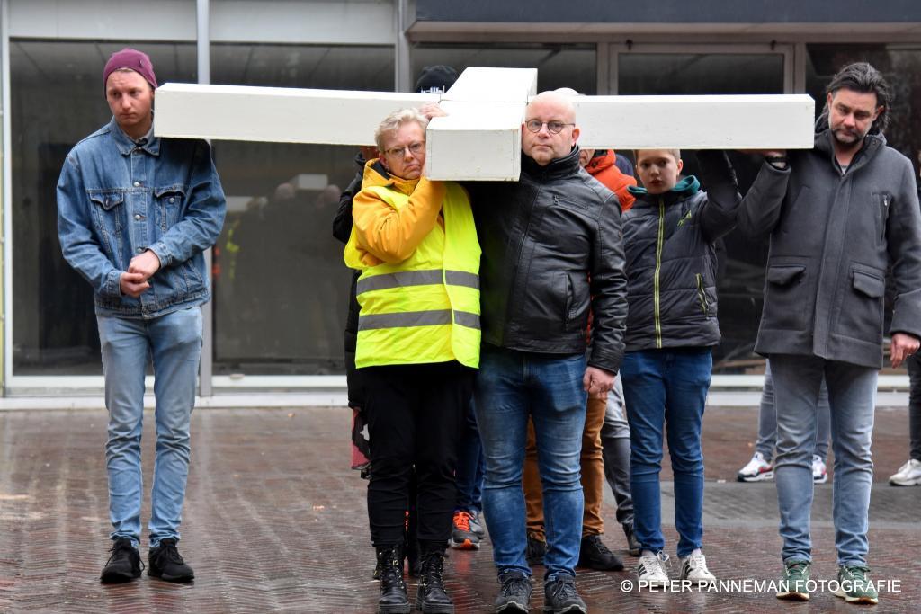 Vandaar ging een groep van circa 150 mensen een grote processie starten met een groot wit kruis door het centrum van Veendam. Ook dit jaar werden de deelnemers tijdens de route meegenomen in het verhaal van de lijdensweg van Christus.