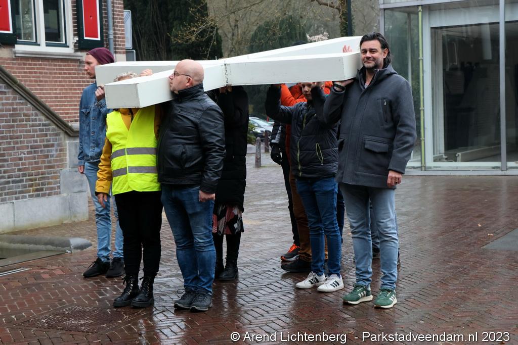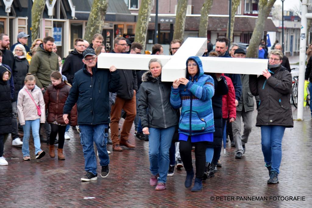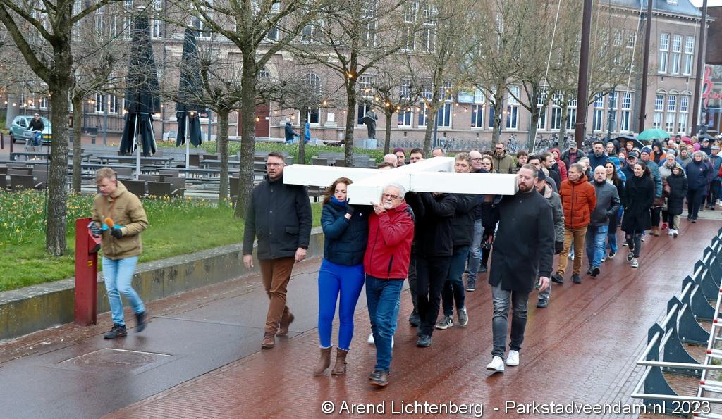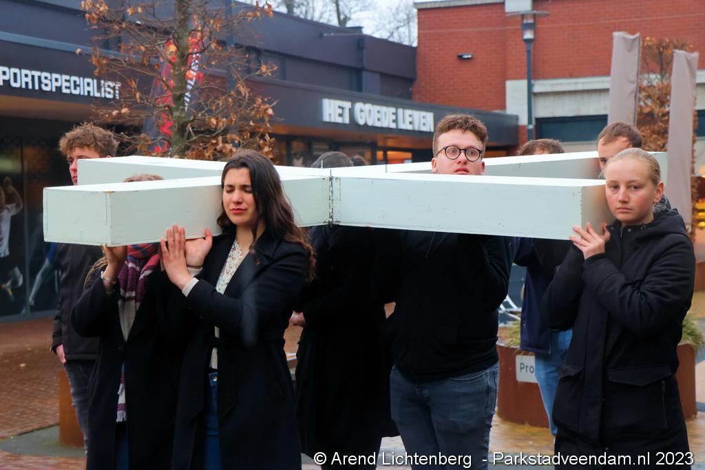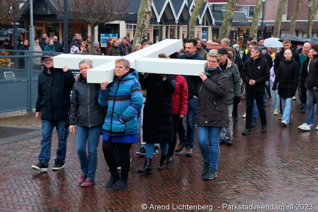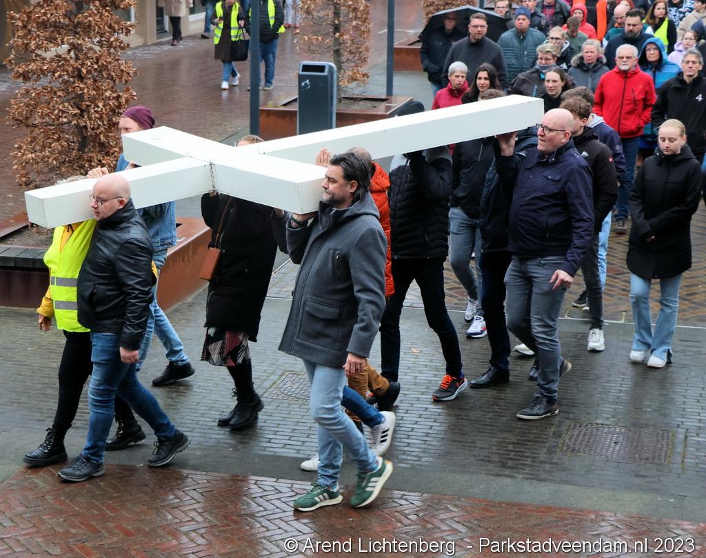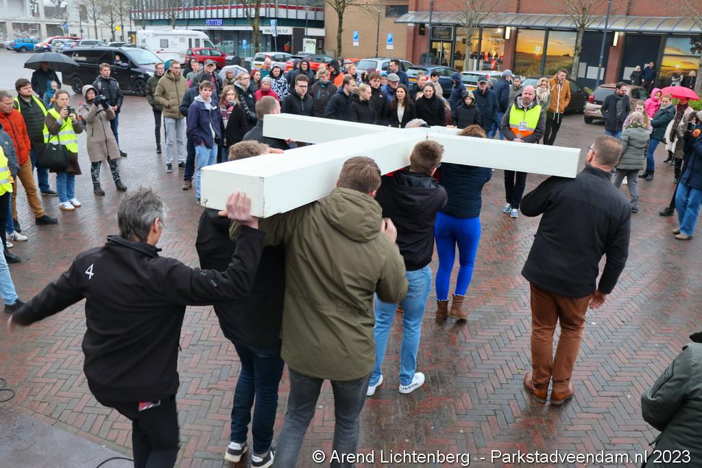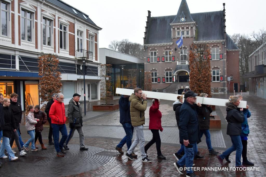 Vandaar ging een groep van circa 150 mensen een grote processie starten met een groot wit kruis door het centrum van Veendam. Ook dit jaar werden de deelnemers tijdens de route meegenomen in het verhaal van de lijdensweg van Christus.