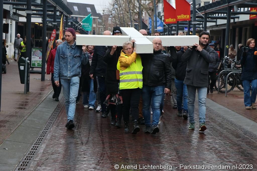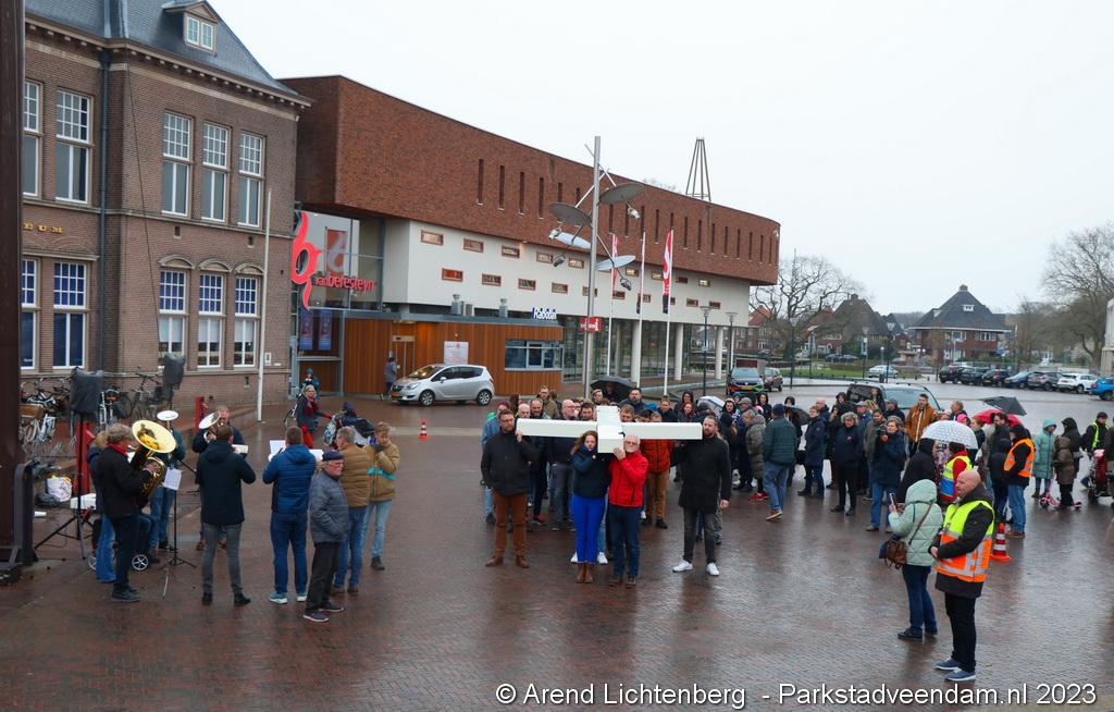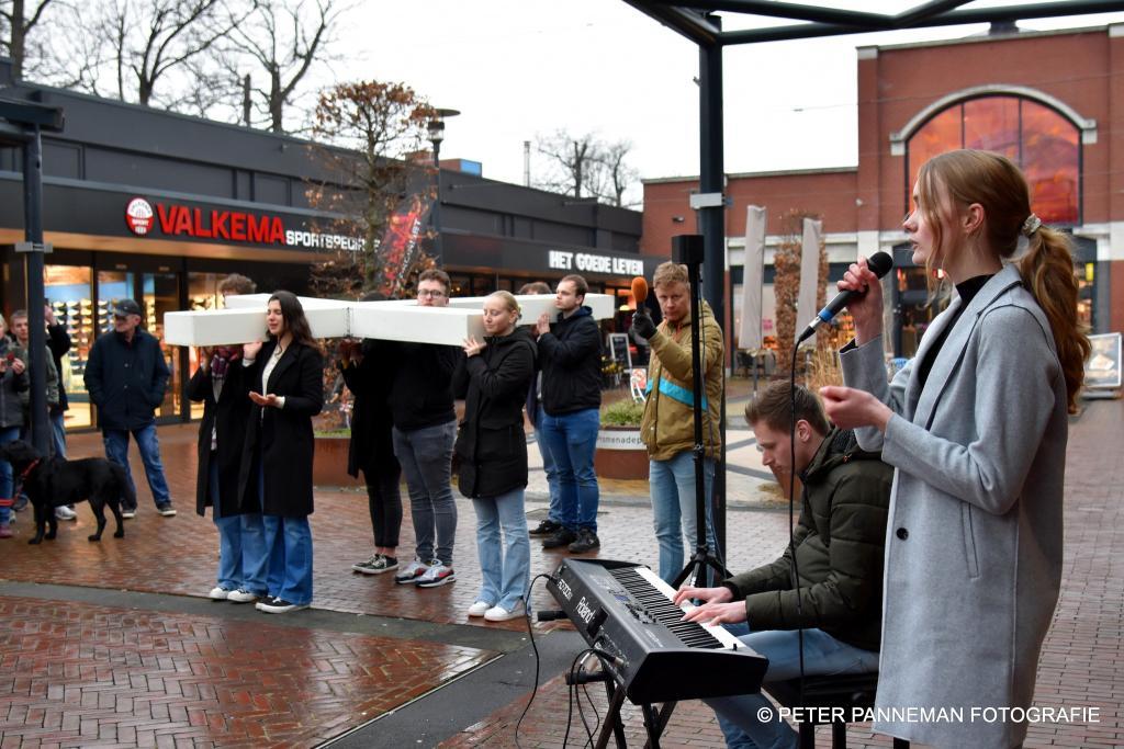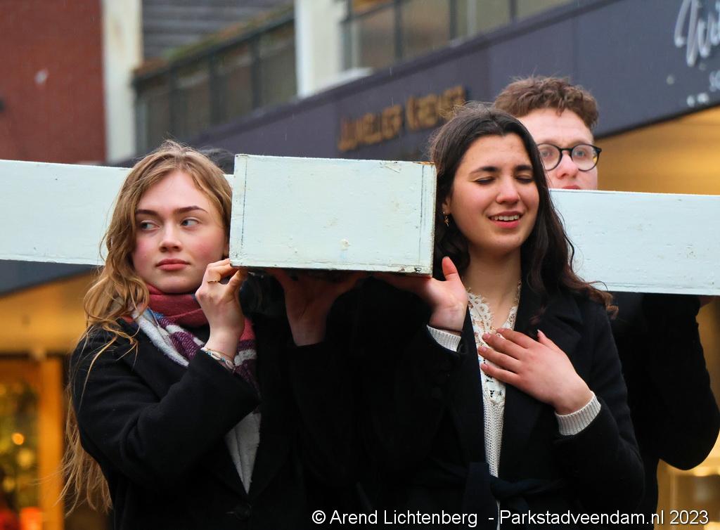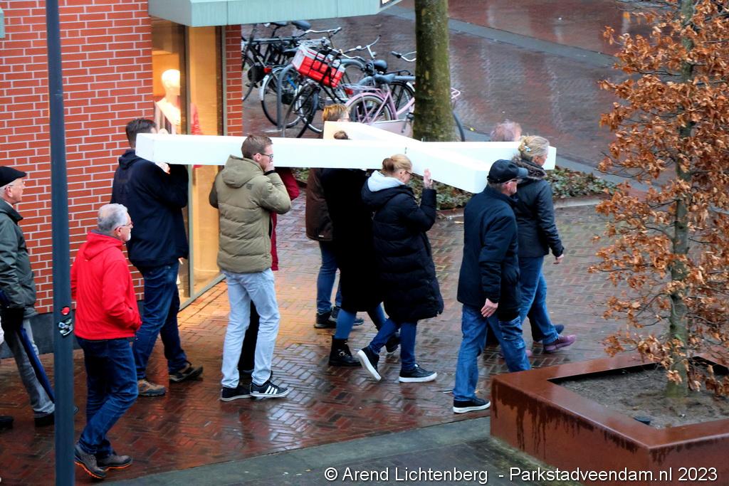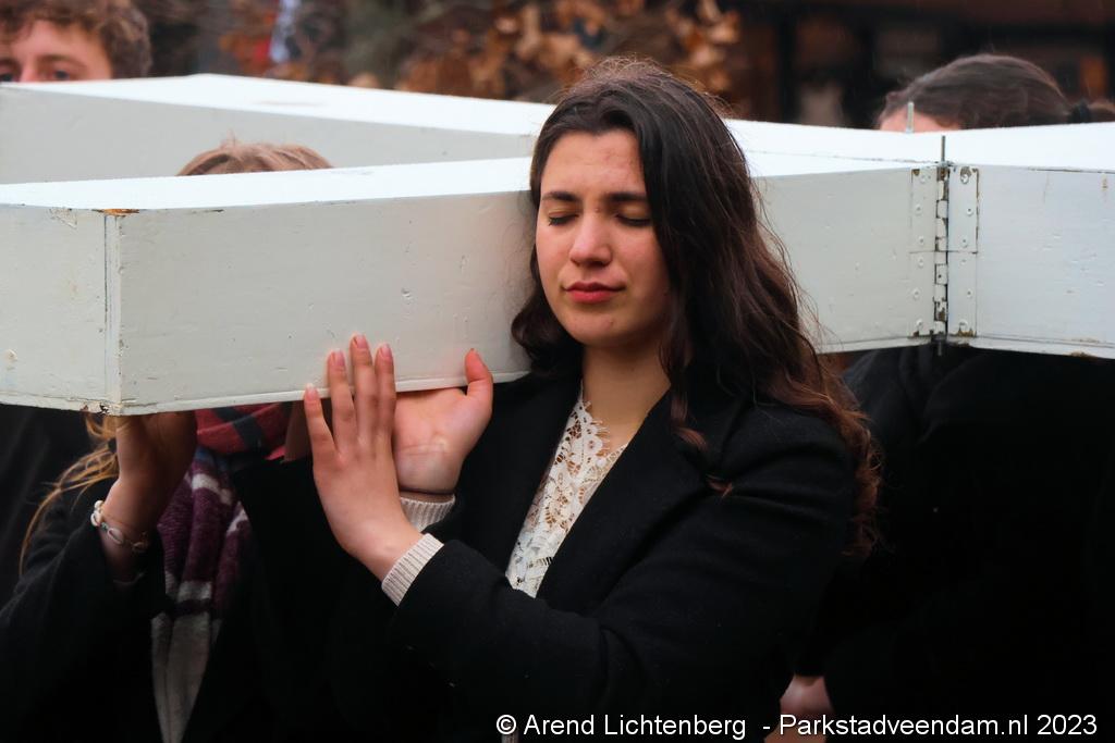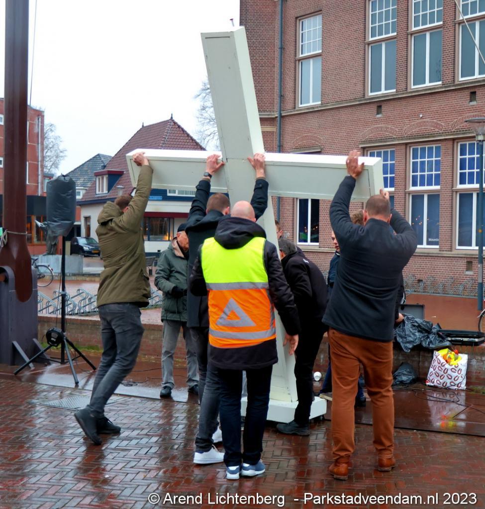 Vandaar ging een groep van circa 150 mensen een grote processie starten met een groot wit kruis door het centrum van Veendam. Ook dit jaar werden de deelnemers tijdens de route meegenomen in het verhaal van de lijdensweg van Christus.