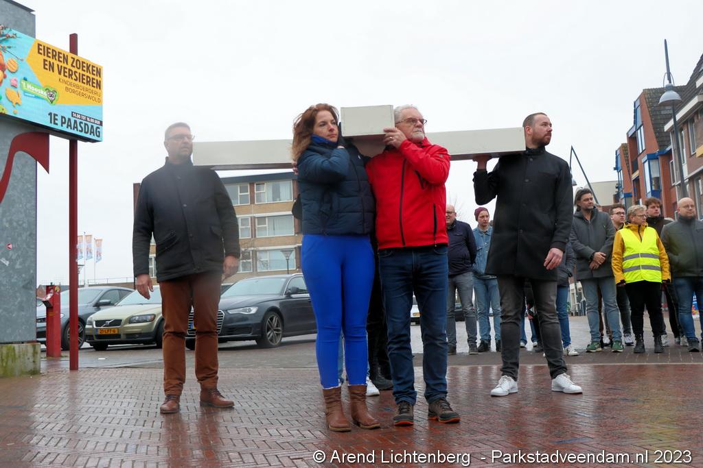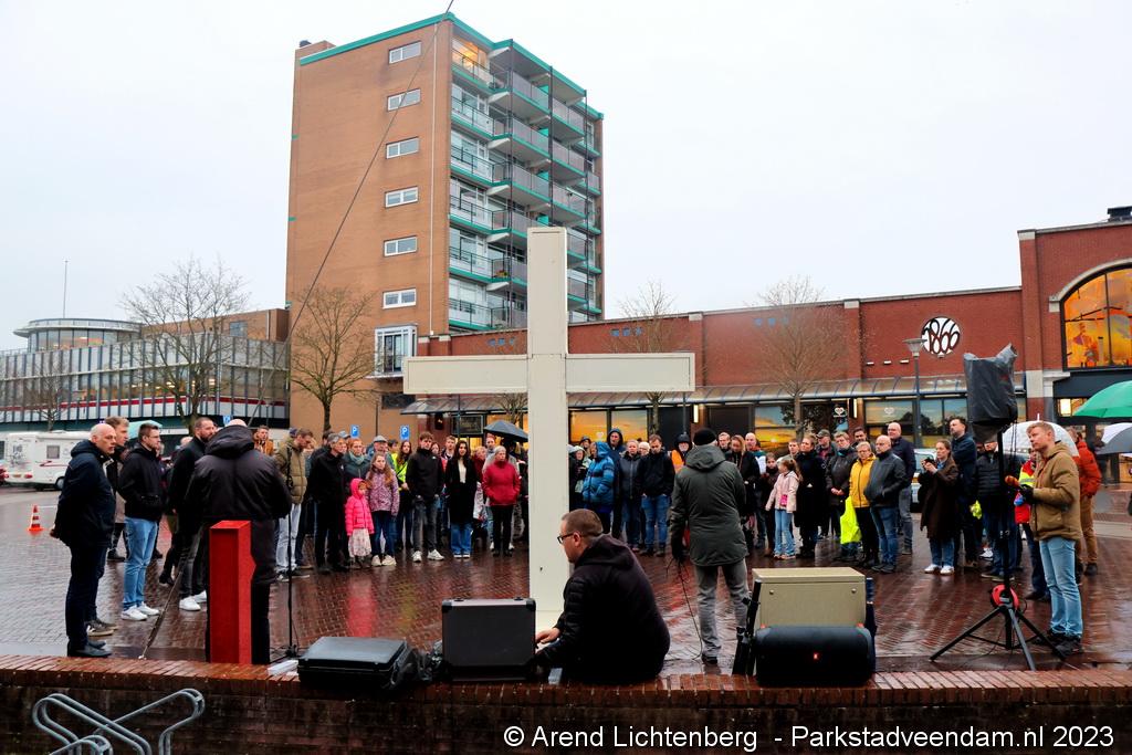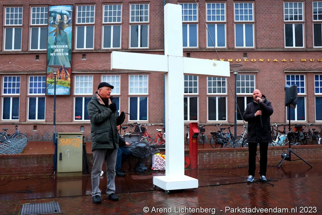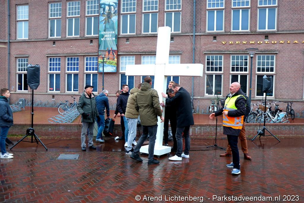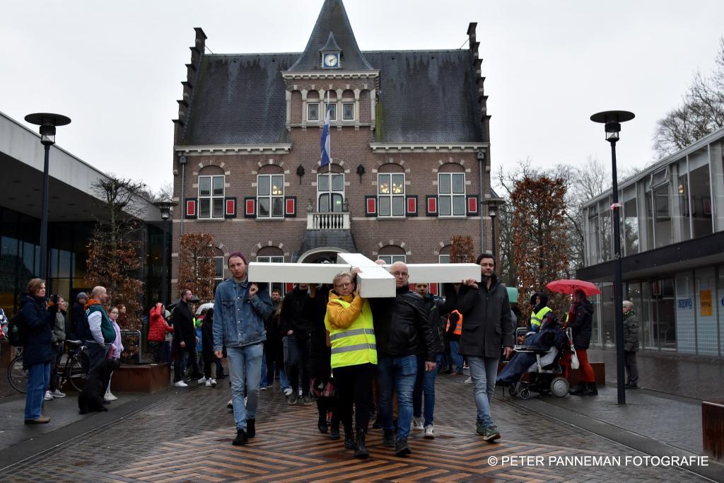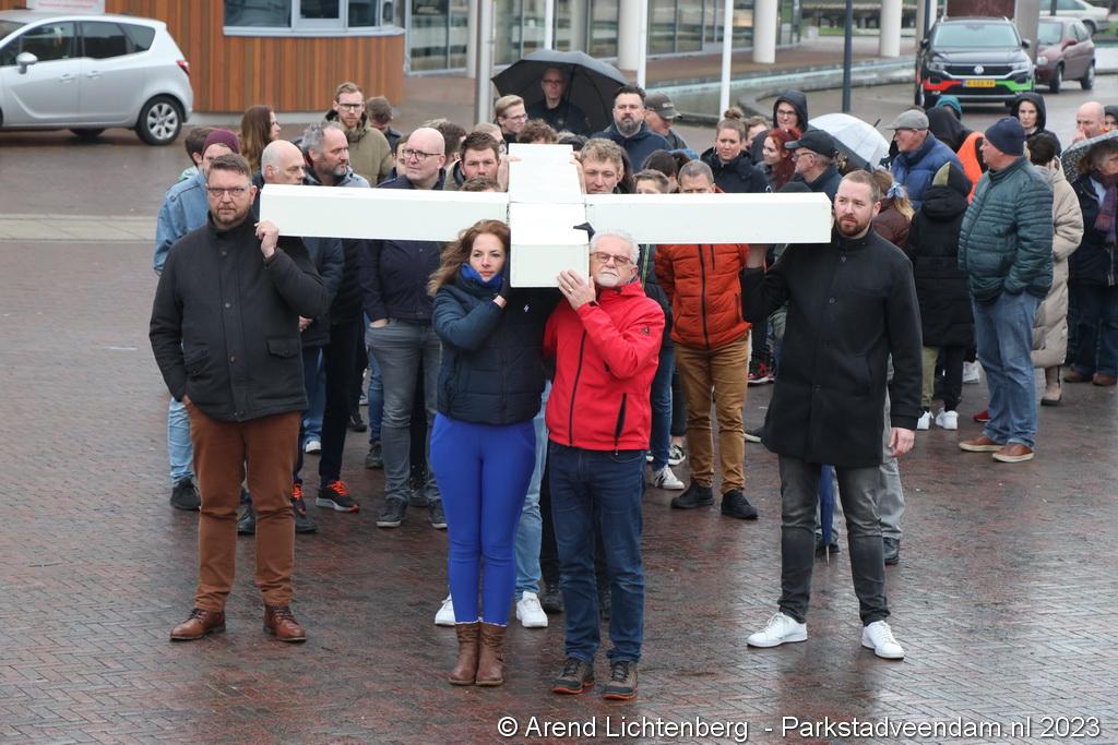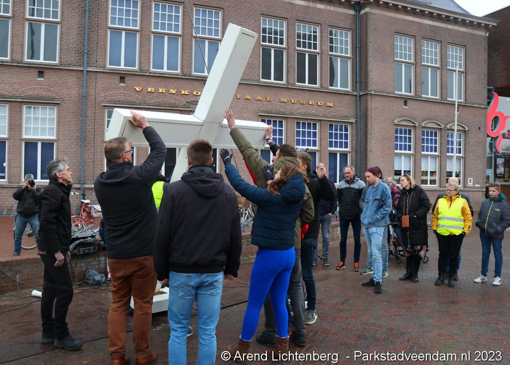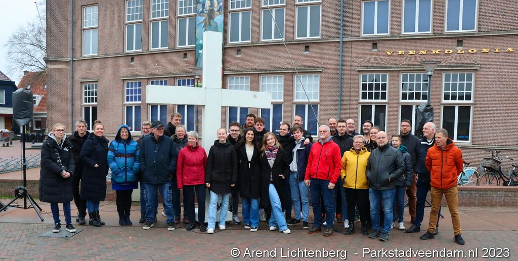 Vandaar ging een groep van circa 150 mensen een grote processie starten met een groot wit kruis door het centrum van Veendam. Ook dit jaar werden de deelnemers tijdens de route meegenomen in het verhaal van de lijdensweg van Christus.