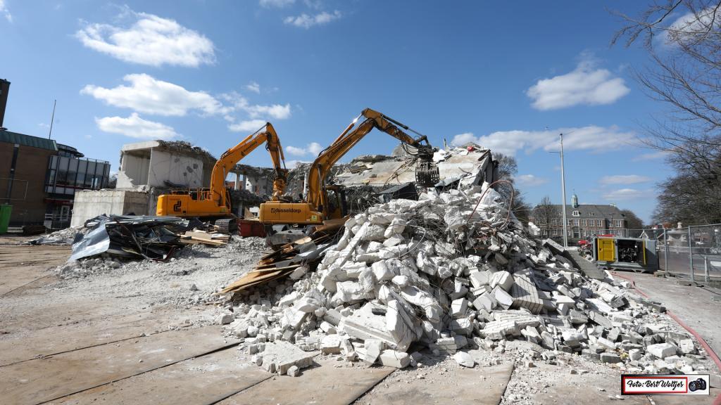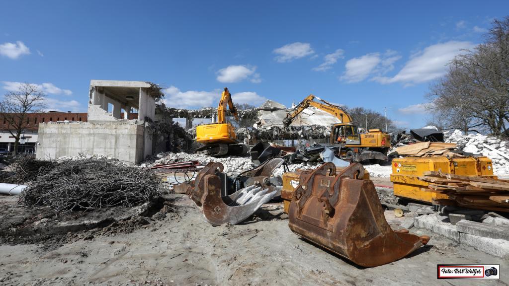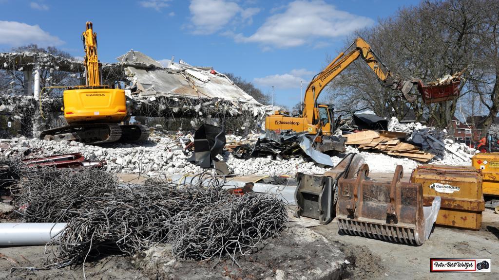 De sloop van het voormalige pand van de RABO bank vordert gestaag. Men is al een aantal weken bezig om het pand met de grond gelijk te maken. Het betonijzer wordt apart gelegd. Hout e.d. wordt ook verzameld en komt in gereedstaande containers terecht. Het zal nog wel een tijdje duren, want ook de funderingen moeten er nog uitgehaald worden.