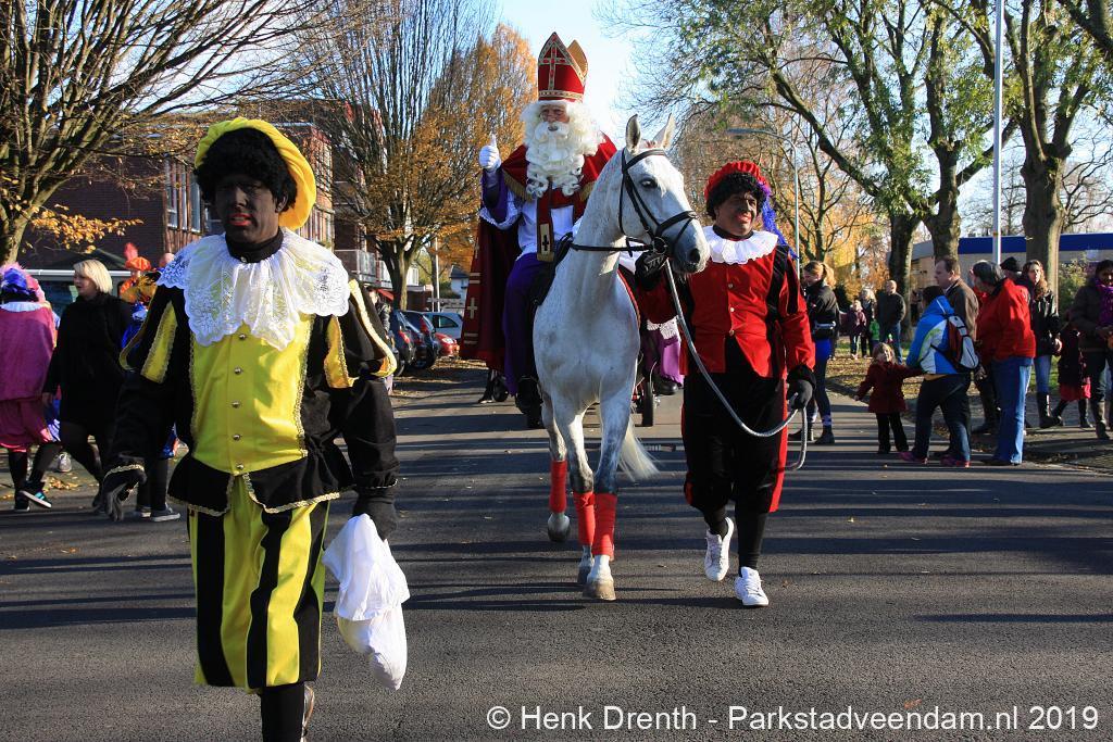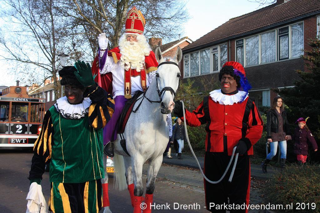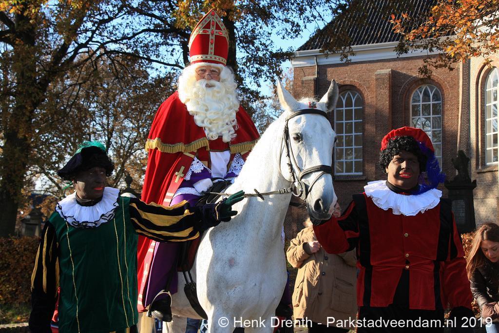 Na voet te hebben gezet aan vaste wal wordt in de Nijveenlaan de stoet opgesteld. En stapt de Sint op zijn trouwe schimmel Amerigo voor het vervolg van de intocht.