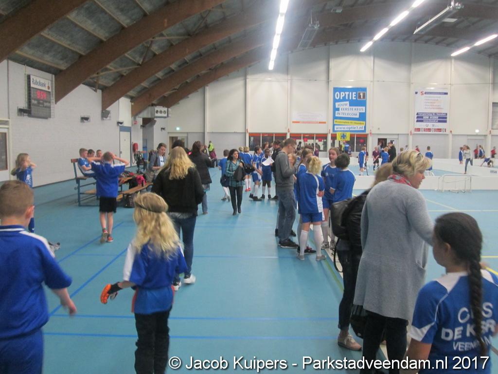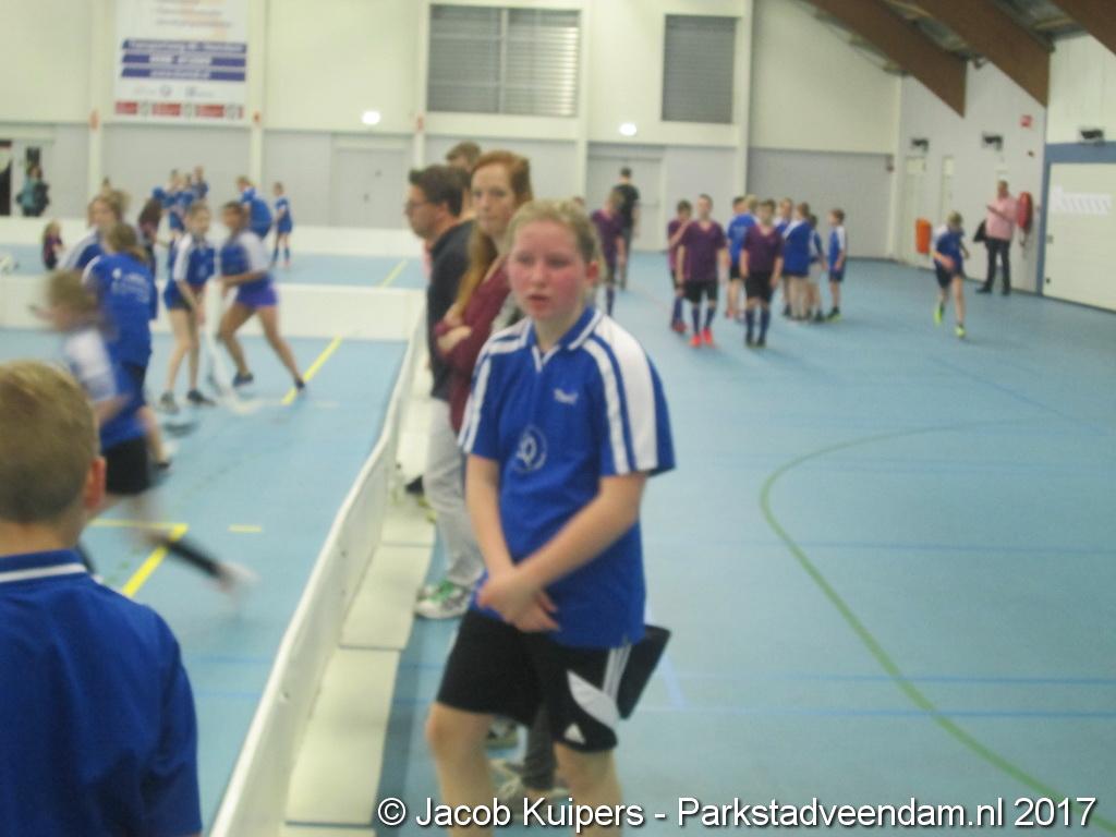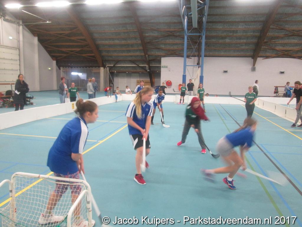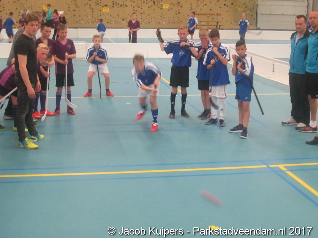 De jongens en meisjes zetten hun beste beentje voor. Maar ze moesten dat niet alleen beheersen. Ze moesten ook nog een stick vast houden om de bal in de gewenste richting te transporteren. En dat ging iedereen niet altijd goed af. Maar de goede wil was er wel. En dat allemaal onder de ogen van hun ouders, opa's en oma's en andere familie leden.