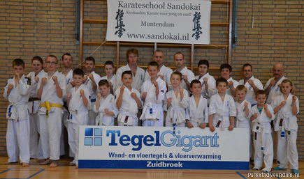 MUNTENDAM - Zondag 30 maart hebben de leden van Karateschool Sandokai in de Menterne in Muntendam met succes hun examen behaald. Het examen is afgenomen op basis van het Full Contact Kyokushin karate. Deze stijl van karate staat bekend om zijn hardheid, respect en discipline, wat men ook terug zag op dit examen. Het was een mooi, maar ook een zwaar examen. Voor zowel de kinderen t/m 11 jaar als de volwassenen duurde het examen tweeënhalf uur en bestond onder andere uit: Kihon (basistechnieken), Kata (schijngevechten), Kumite (vrij vechten) maar ook verschillende zware (conditie) oefeningen. Het examen is namens de International Federation of Karate (IFK) afgenomen door Sensei Mark Dol (leraar), Sempai Peter Musch (assistent-leraar) en Sempai Melissa Geukens (assistent-leraar).