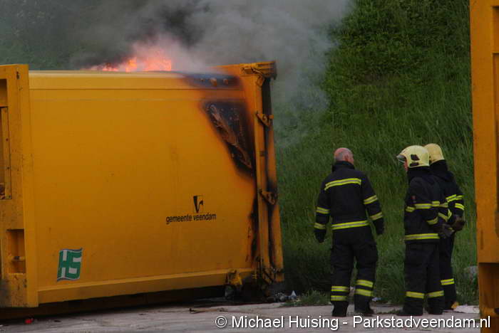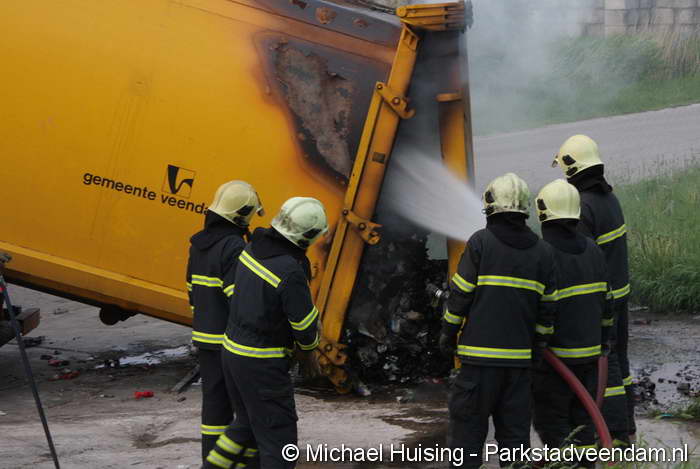 Een deel van het huisvuil vatte vlam. Eén van de brandweermannen die ook werkzaam is bij de gemeente heeft het haakarmvoertuig van de gemeente opgehaald zodat de container leeggegooid kon worden.