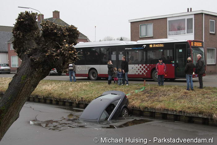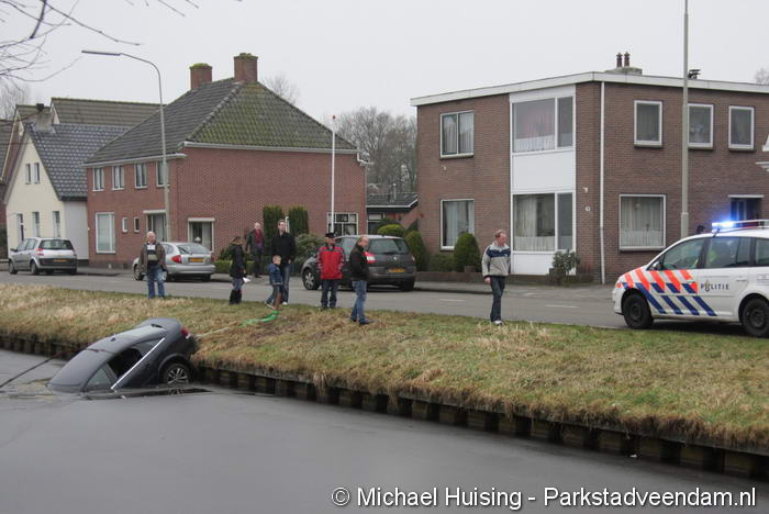 Ter plaatse bleek dat het voertuig van een oprit was gerold. De politie die wel ter plaatse kwam heeft de berger geïnformeerd zodat het voertuig weer uit het water kon worden getakeld.
