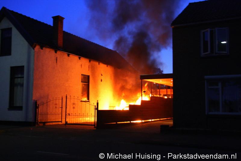 We zijn bij een brand in een garagebox aan de Sinnigeslaantje in Veendam. Met meerdere voertuigen ter plaatse vanwege de waterwinning.