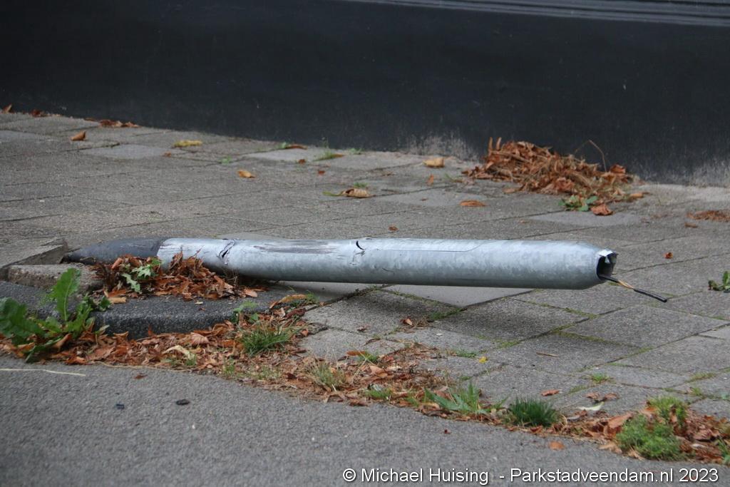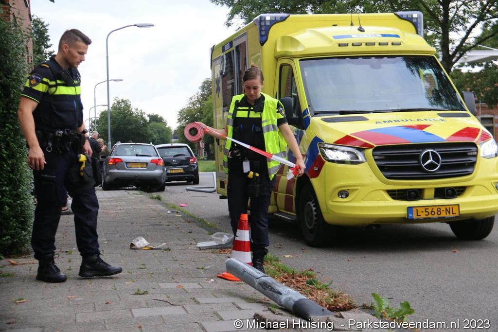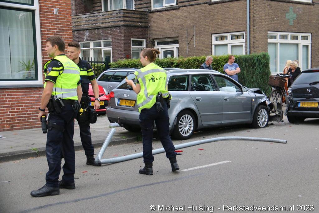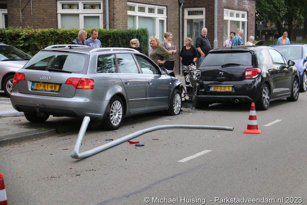 De ravage was groot waarbij twee voertuigen flink beschadigd waren en een lantaarnpaal volledig was afgebroken.