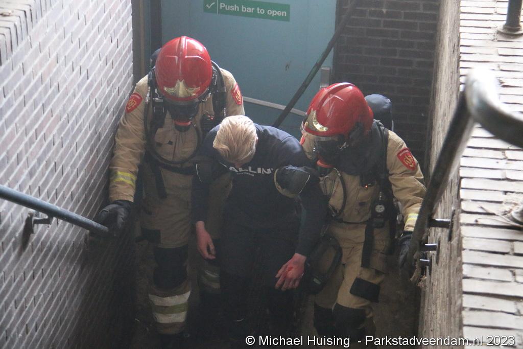 In de kelder van het gebouw zijn op hetzelfde moment mensen bezig een voormalig drugslab op te ruimen waarbij een brand ontstaat. Onder aan de trap ligt een bewusteloos persoon, als deze na 10 minuten niet is gevonden komt hij bij en loopt hoestend naar boven. Hier meld hij dat er brand is in de kelder en dat er nog iemand binnen is.