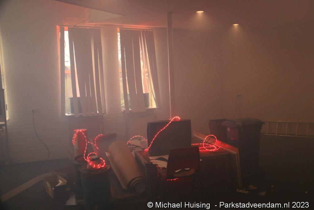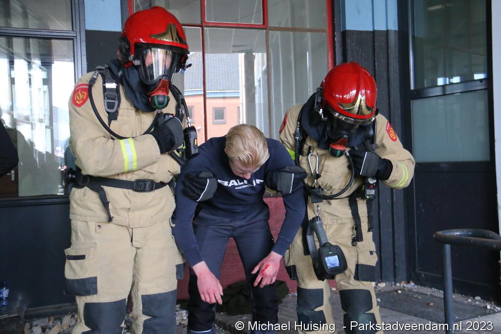 Aan de voorzijde (J.G. Pinksterstraat) bij de hoofdingang werd de klasse brandbestrijding gespeeld.  Hier was door een boze medewerker op meerder plekken brand gesticht in het pand.
