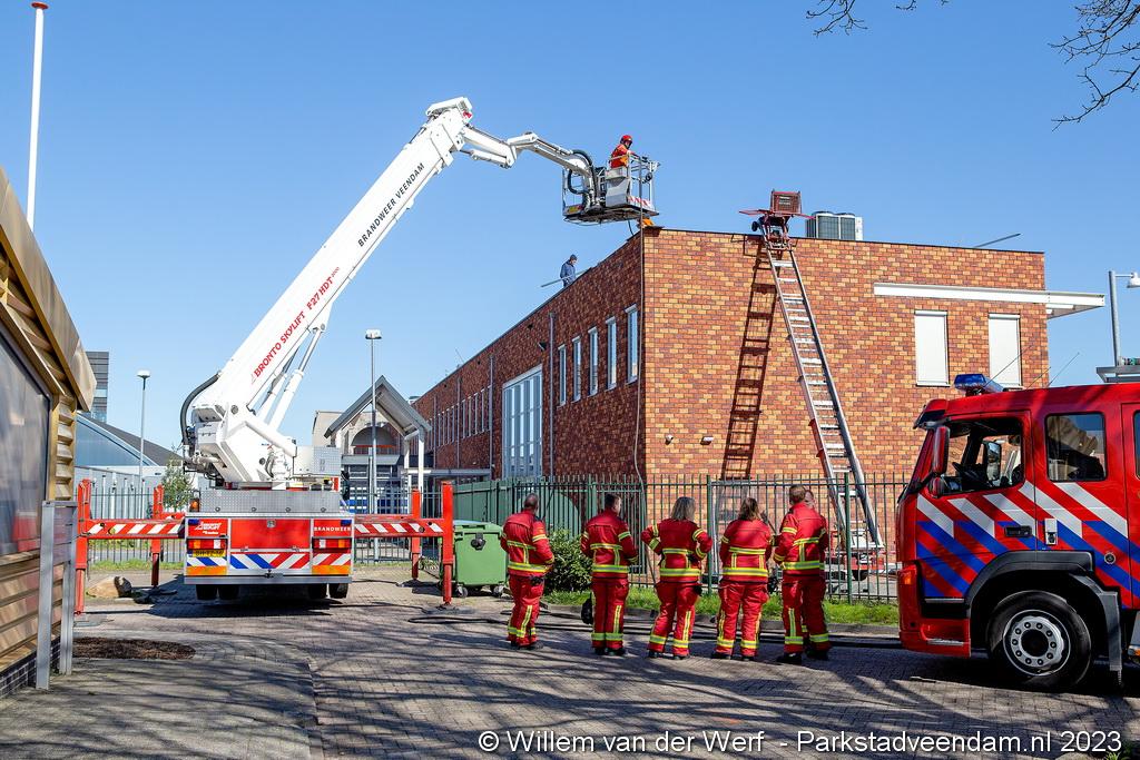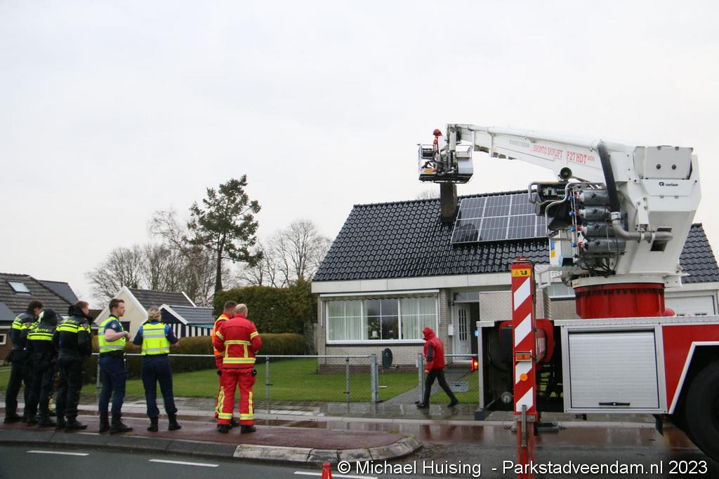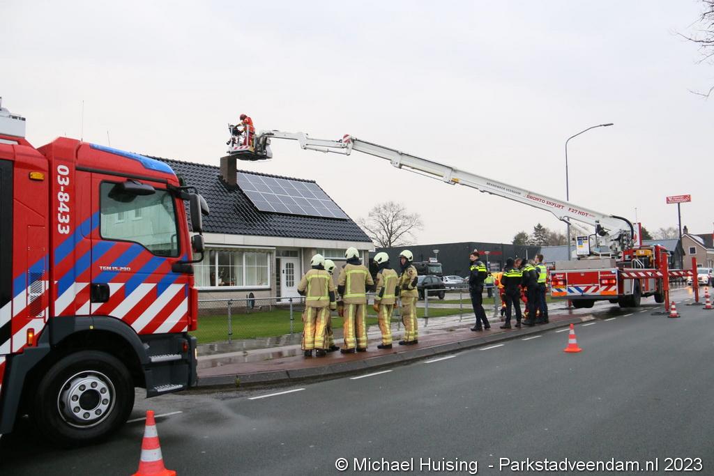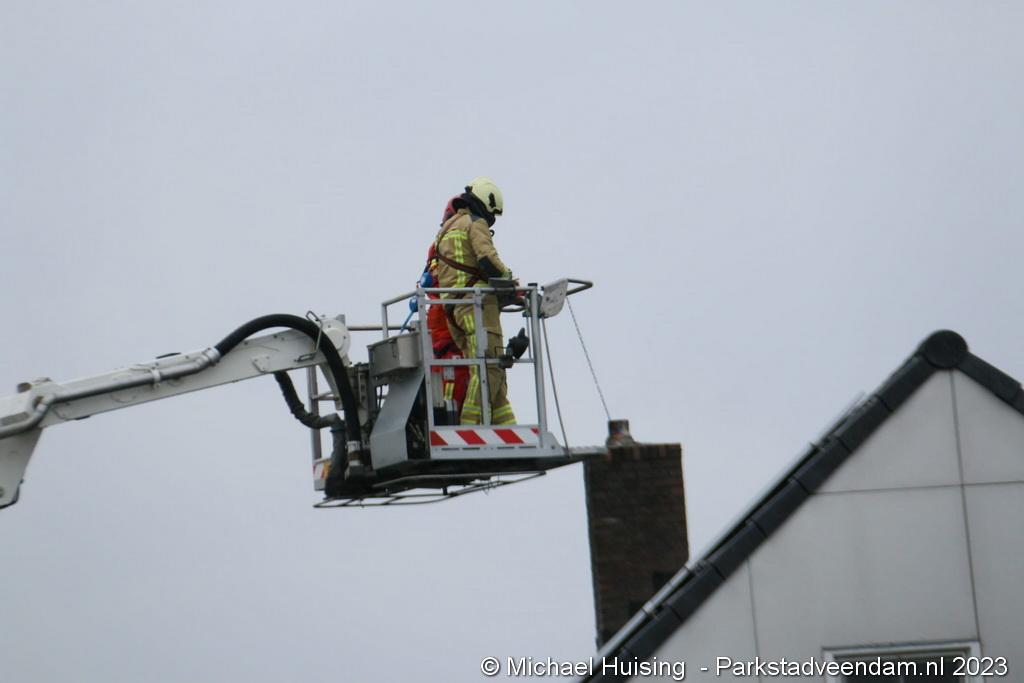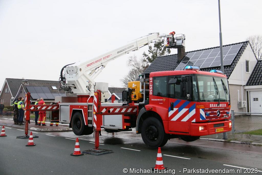 De brandweer van Veendam kwam met hun hoogwerker om de schoorsteen te vegen.