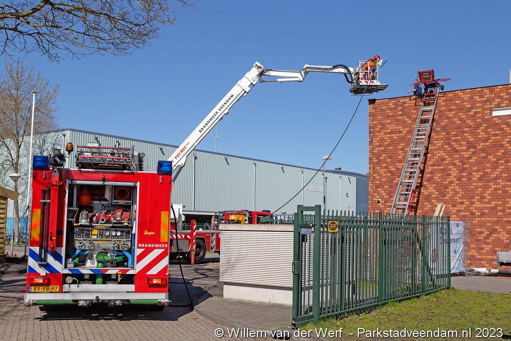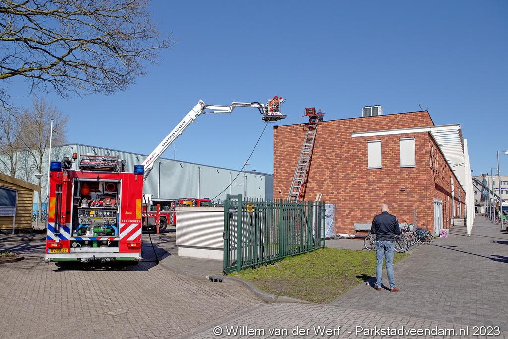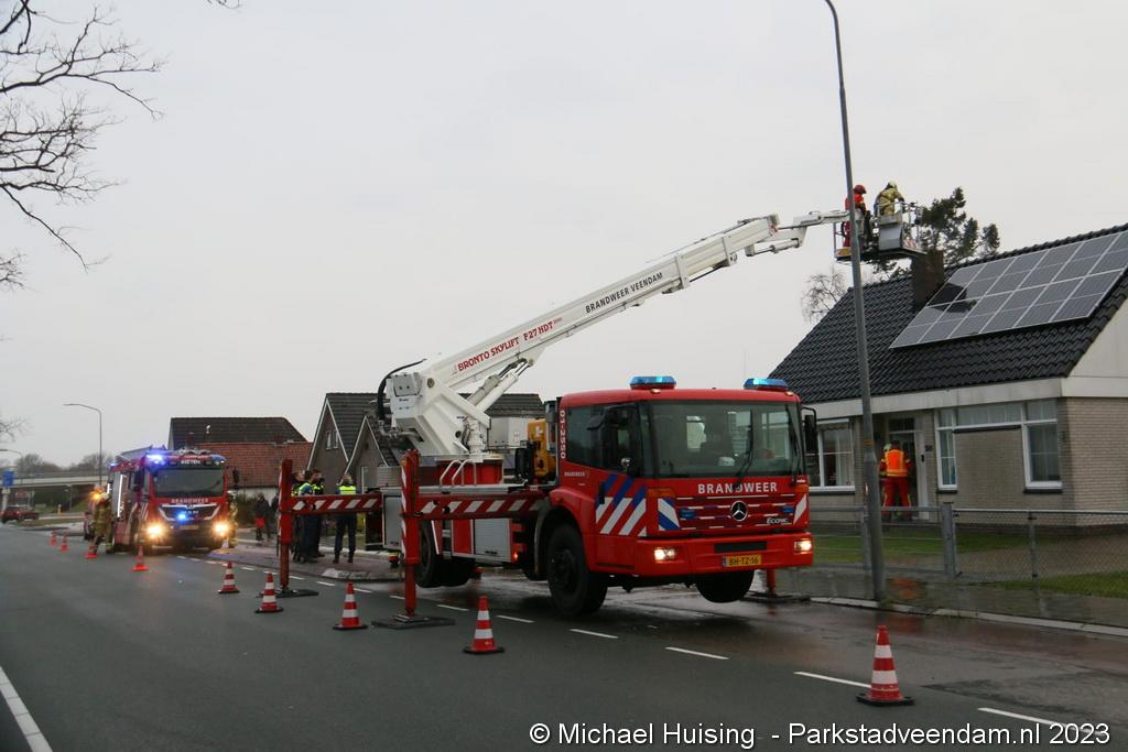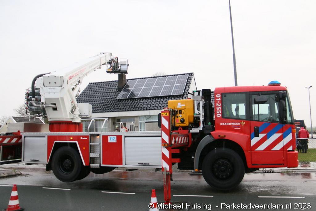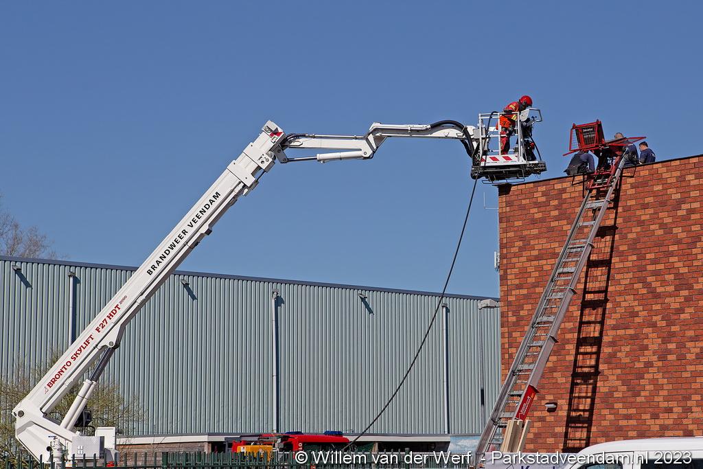 De brandweer van Veendam kwam met hun hoogwerker om de schoorsteen te vegen.