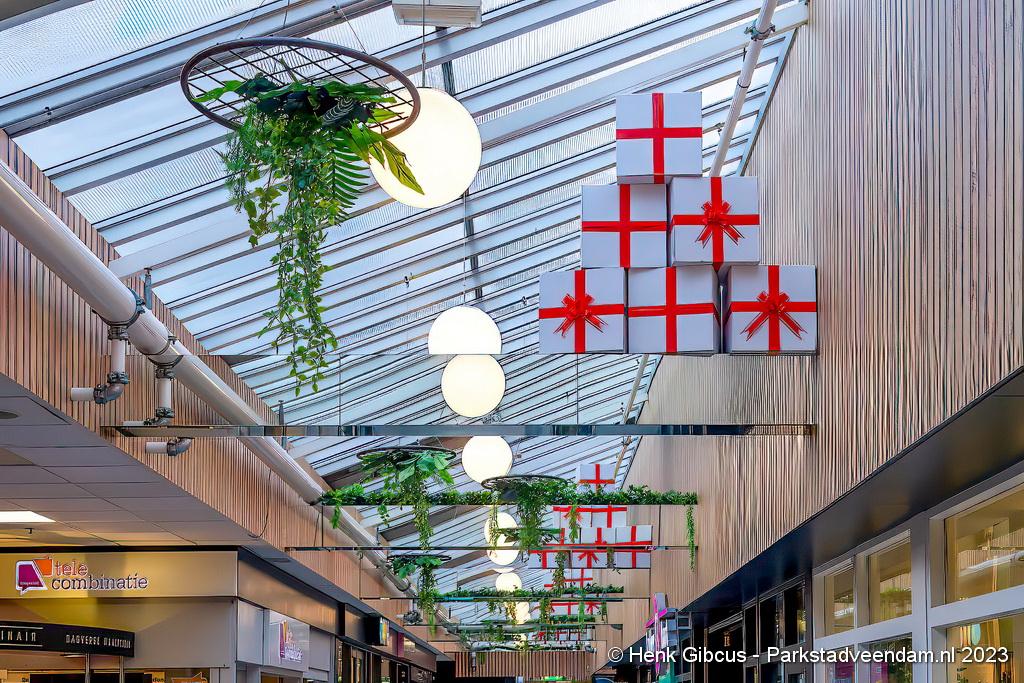 Het thema dit jaar is: rood en wit. Ze maakt grote witte geschenkdozen met een fraaie rode strik en plaatst die door het gehele winkelcentrum heen. Staand op de grond en bovenop de constructiebalken.