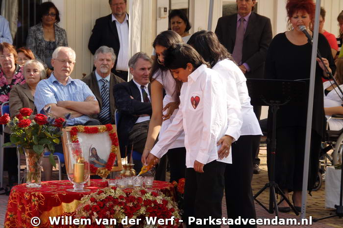 VARSCHA - Zondag 23 september 2002 is het precies 5 jaar geleden dat de Veendamse Varscha Mohansingh levenloos werd gevonden in de badkamer. De toen 14-jarige Varscha Mohansingh werd op die bewuste dag dood aangetroffen. Na drie maanden werd de moordenaar, Kris J, een ver familielid van de familie Mohansingh, opgepakt en in 2004 door het gerechtshof in Leeuwarden veroordeeld tot tien jaar gevangenisstraf en TBS. Overigens ontkent Kris J momenteel nog, dat hij onschuldig is. Ter nagedachtenis hebben de ouders van Varscha een monument laten maken door kunstenares Johanna Nijlunsing uit Glimmen. Zondag 23 september 2007 was dus het moment gekomen om het monument te onthullen van Varscha. En wel in de voortuin van de familie Mohansingh. “Veel mensen zullen het waarschijnlijk onzin vinden”, zei de 16-jarige zus Chanu en haar emotionele toespraak. “Maar wij niet, het is een teken dat ze dicht bij ons is”.