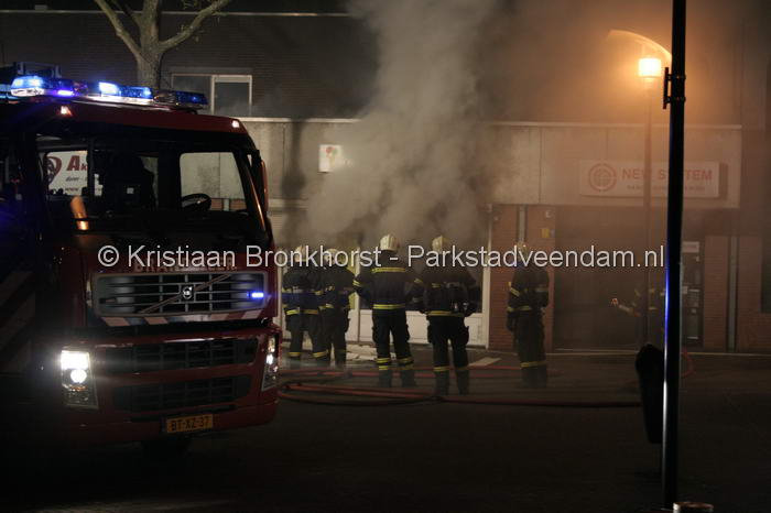 AUTORAMA - Zondagochtend was het weer raak in Veendam. De brandweer moest met groot materieel uitrukken voor een hevige brand in het winkelcentrum Autorama aan het Beneden Oosterdiep. De brand is tegen 4.00 uur, buiten tegen de voorgevel ontstaan en via de overkapping sloegen de vlammen over naar het dak van het winkelcentrum.